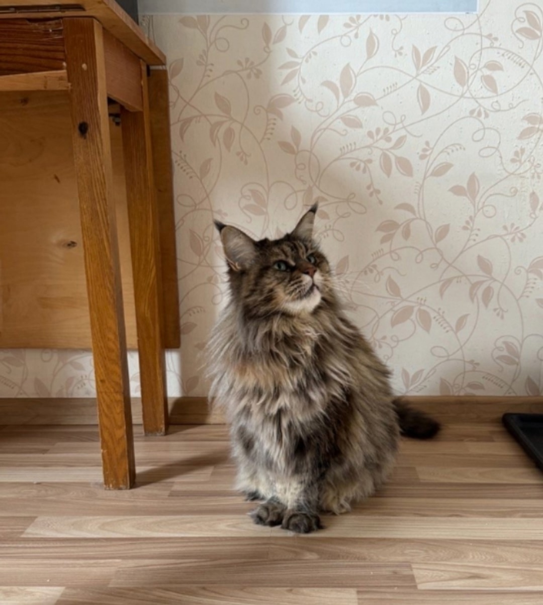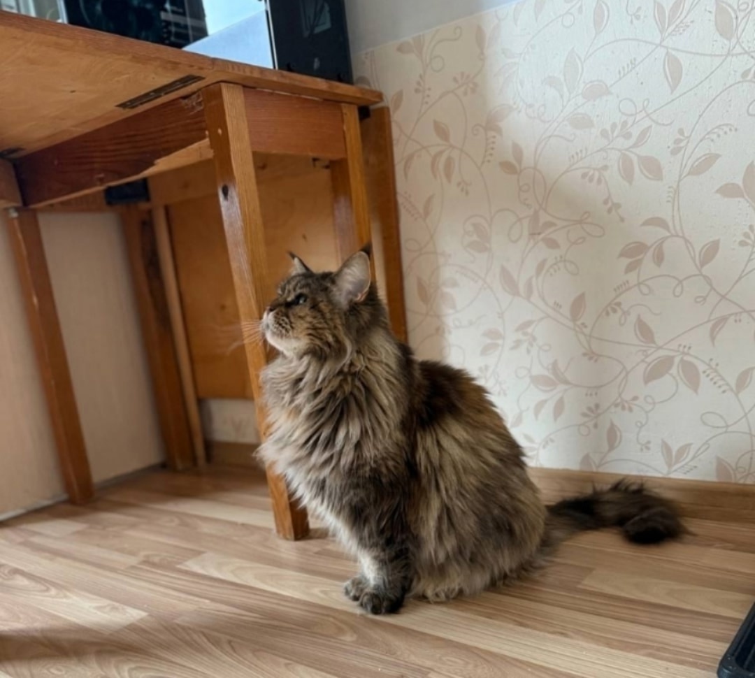 Фенотип мейн куна, но документов нет, т.к. была подобрана истощённой в области, скиталась с таким же котом (кота не нашли, куда-то пропал)