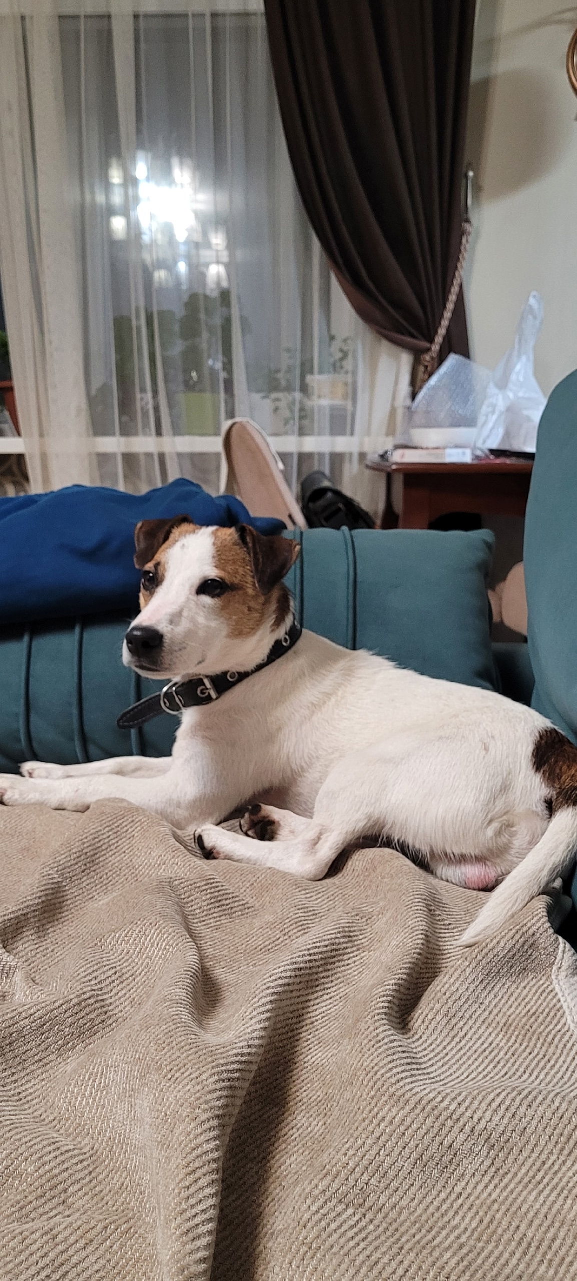 Найдена собака породы джек рассел. Собака бежала вдоль проезжей части несколько остановок. Людей обходила стороной, но к детям подошла. Дети поймали. Собаки не пугливая. Не боится людей, собак, машин.