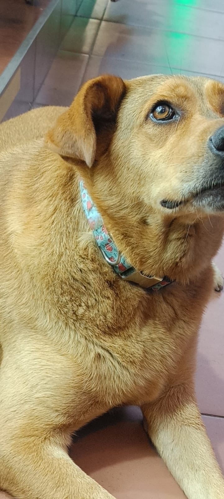 С биркой , стерилизована . Бирюзовый ошейник с номером телефона .