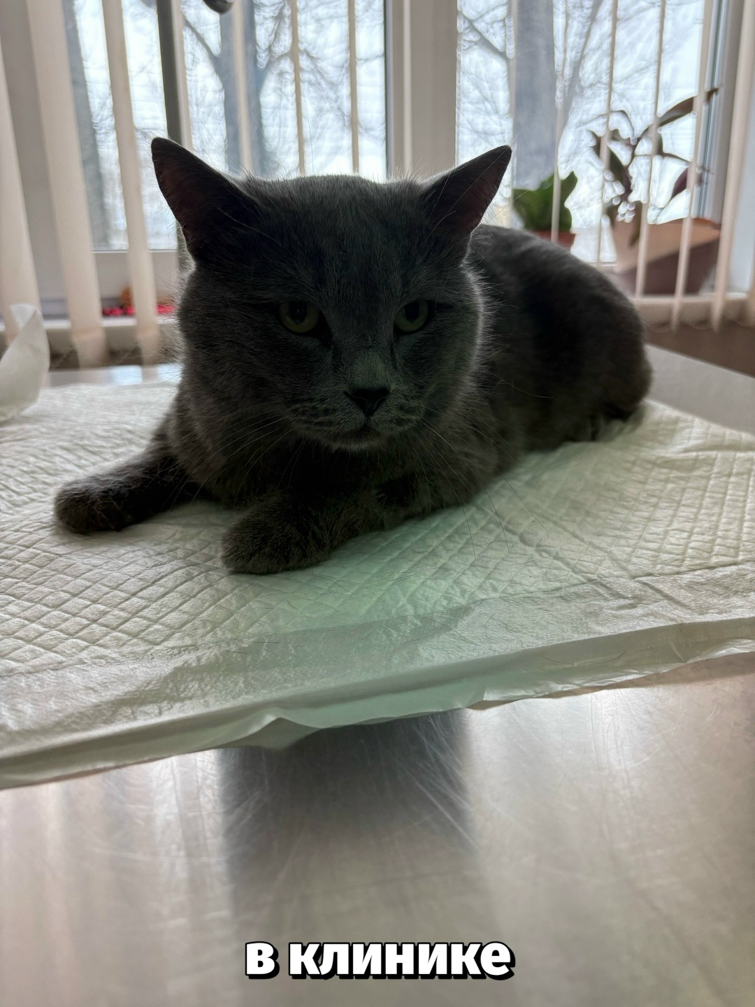 💬 Кот страдает от стресса и очень напуган. Возможно была травма головы. Сегодня пойдём ставить катетер, так как он в стрессе и не может сходить в туалет. Он просто не понимает как и куда.