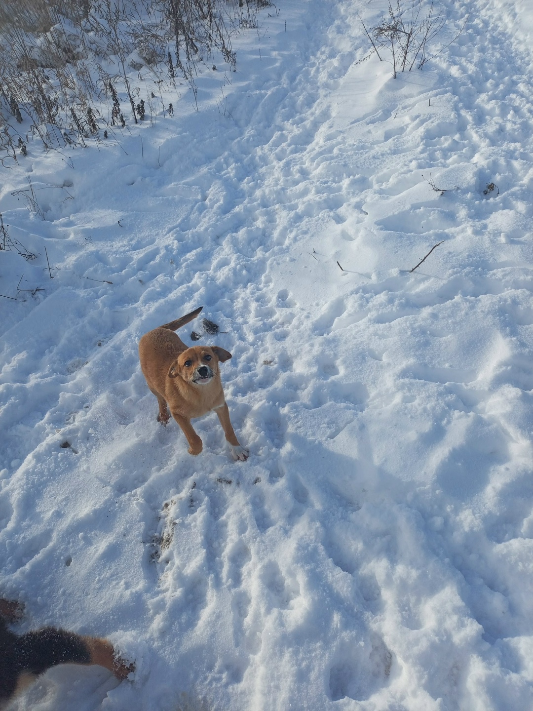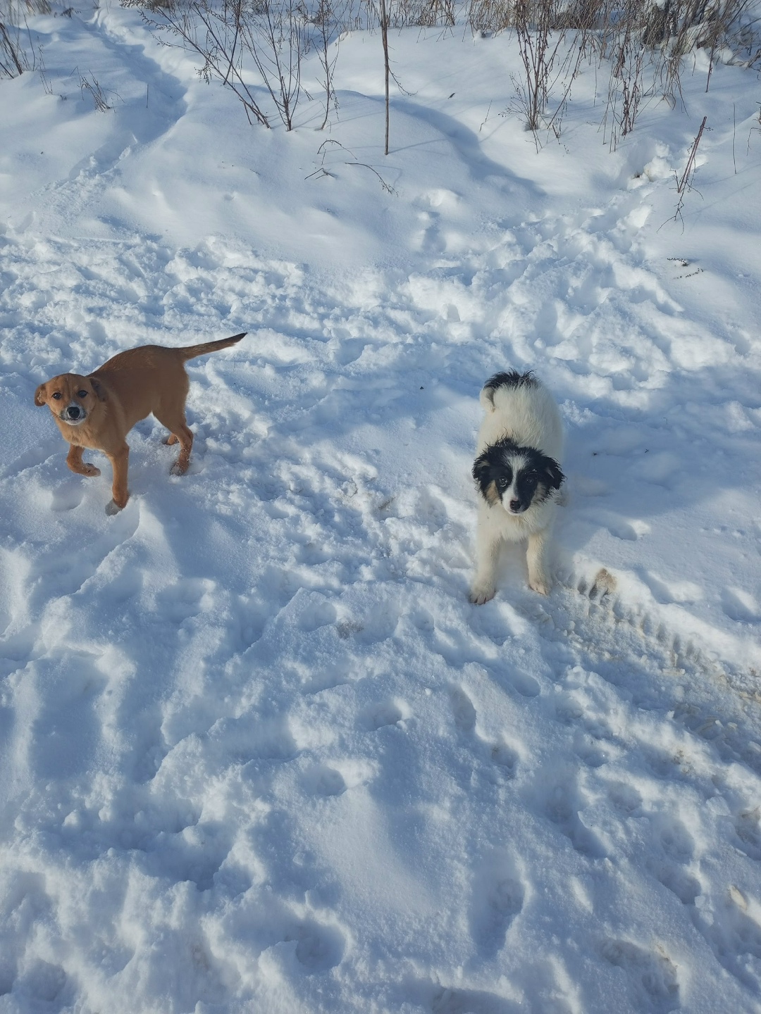 Четырёх щенков какой-то нелюдь вывез за город фактически в чистое поле. Их случайно нашли люди и начали ездить кормить малышей. Так как укрытия у них не было, а погода сами видите какая им привезли будку, чтобы было где спрятаться от снега и ветра.