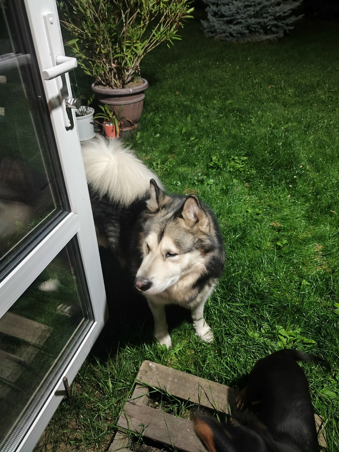 12.09 этот красавец пришел ко мне во двор и не уходит, видно что хозяйский, ухоженный. По информации умной камеры это аляскинский маламут. Адрес нахождения Курский район, 1-е Курасово.