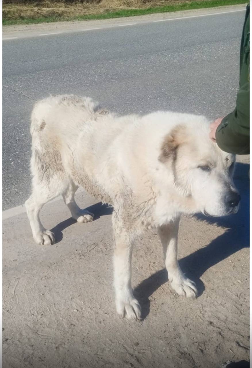 Похоже, Выкинули алабая у дороги, молодой, сидит третий день, видимо ещё избили, так как сложно встает, кобель, довольно контактный, нашедшие смогли только покормить…
