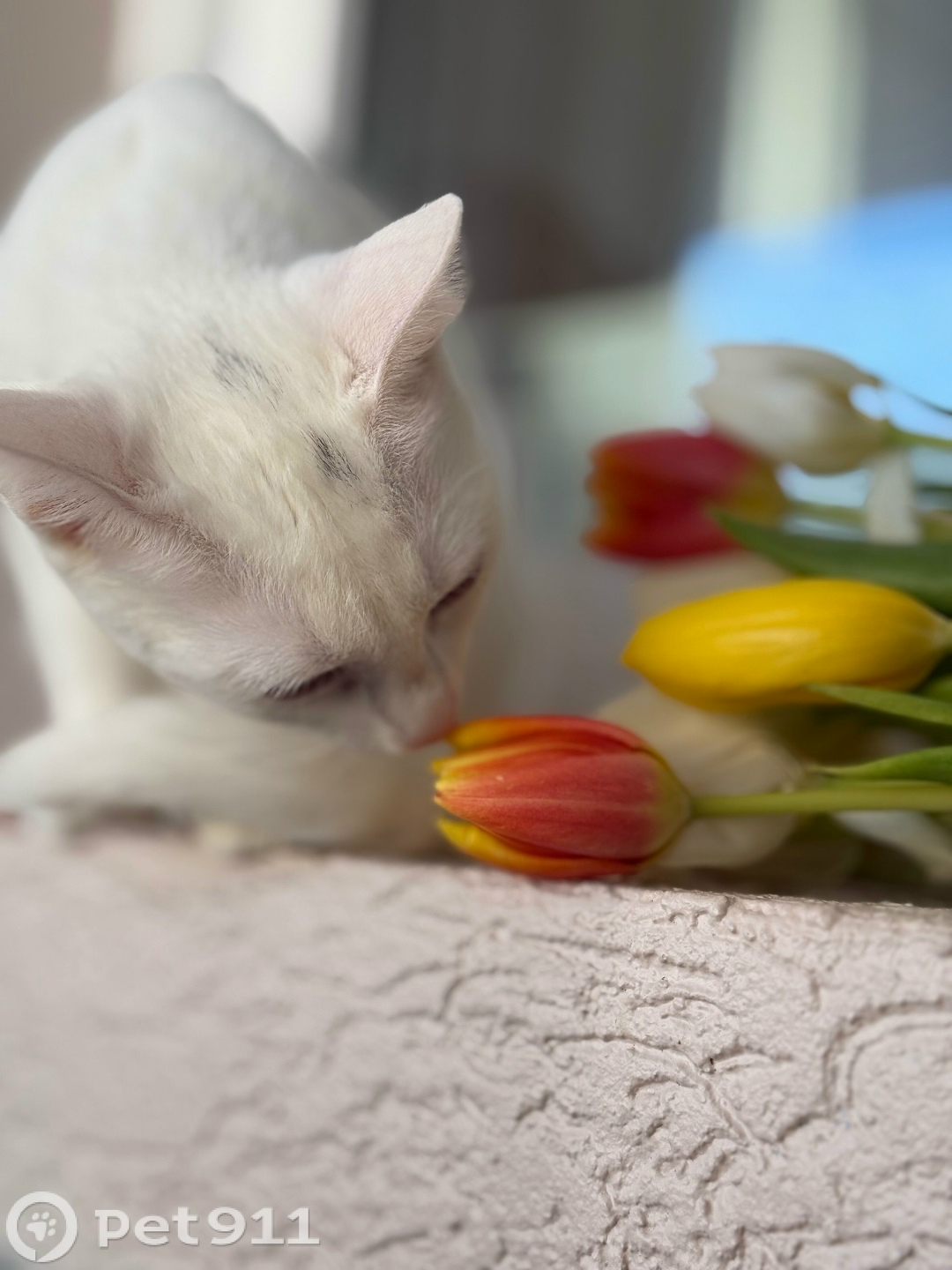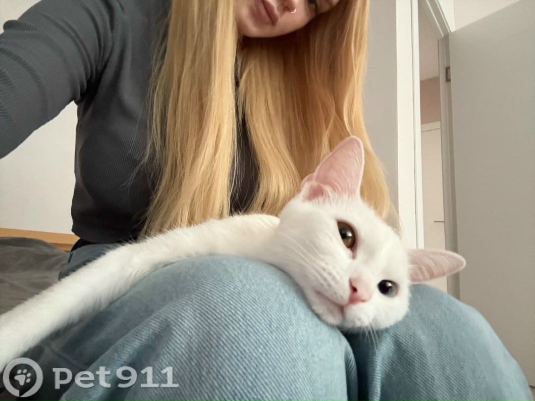 Полностью белая, глаза разного цвета (голубой и карий), ошейник в виде ожерелья с розовым сердечком