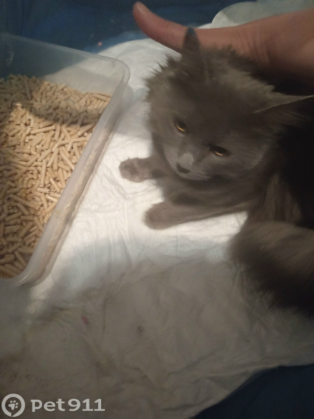 Кот или кошка забежала в подъезд и квартиру. Цвет дымчато-серый, шерсть длинная, молодая. Напугана. В руки потом пошла спокойно