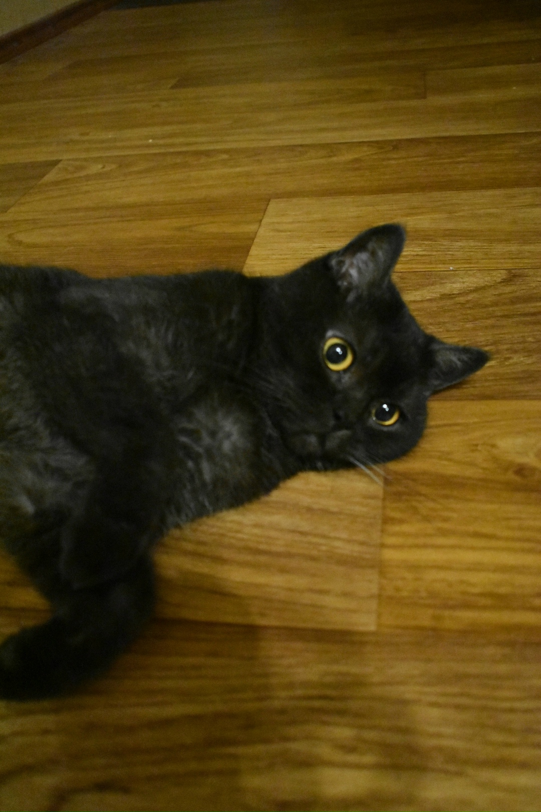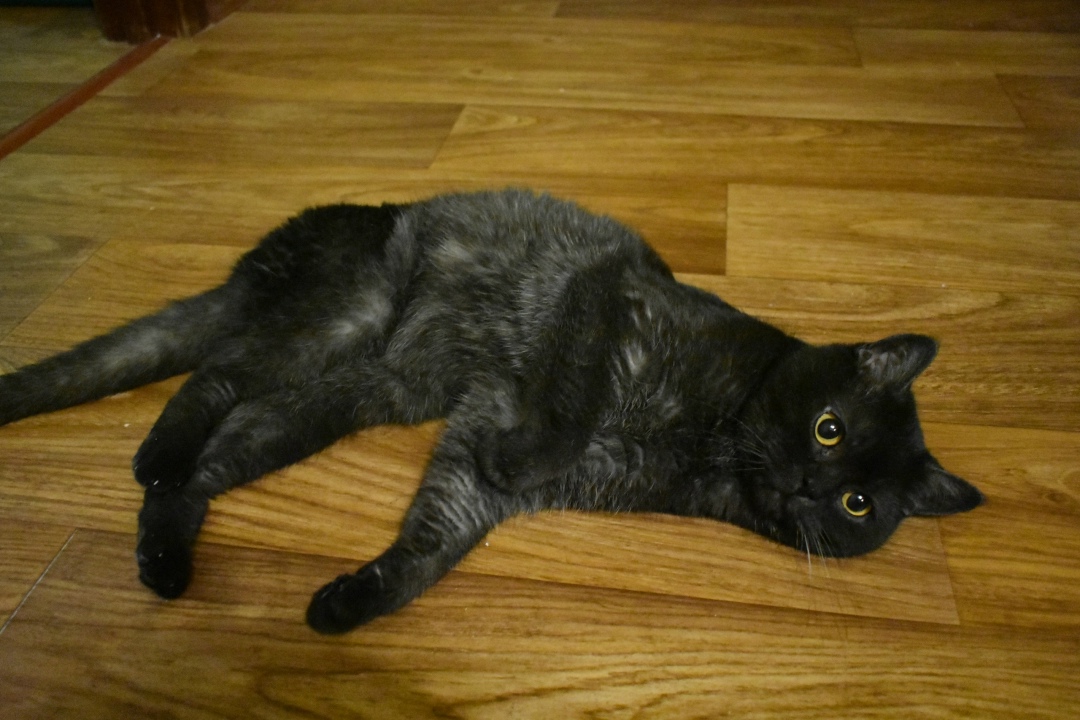 Ему примерно 1–2 года. Это, скорее всего, метис шотландской кошки, окрас чёрный с серым подшёрстком 🖤, глаза жёлтые. Он осмотрен ветеринаром, здоров, кастрирован. Раньше был очень худой — были видны позвоночник и рёбра, сейчас немного откормили.