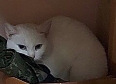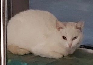 Белый окрас, глаза голубые - пол не определили, так как животное напугано и агрессирует.