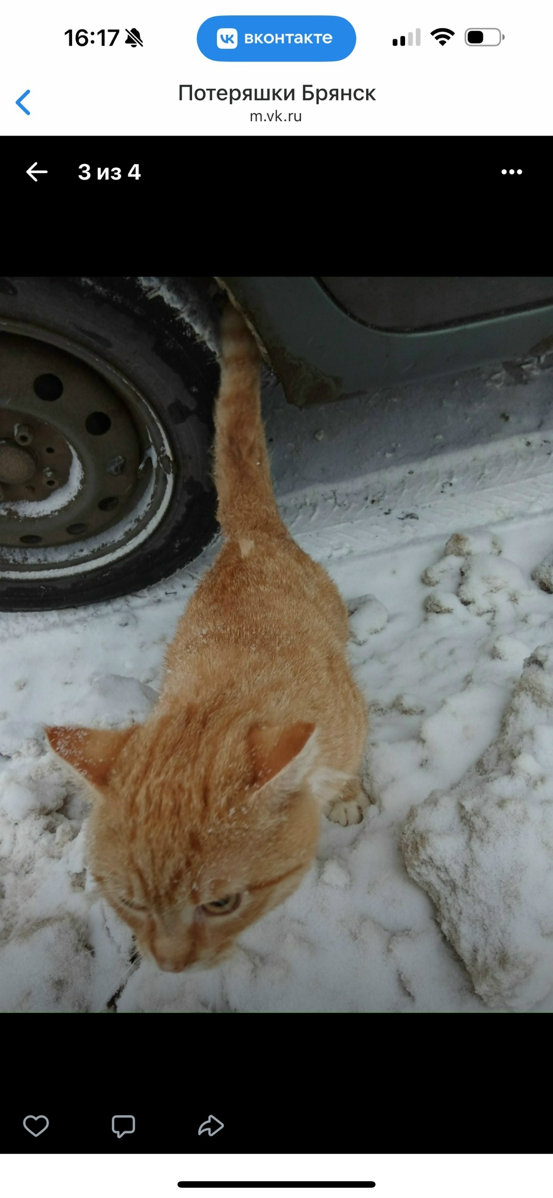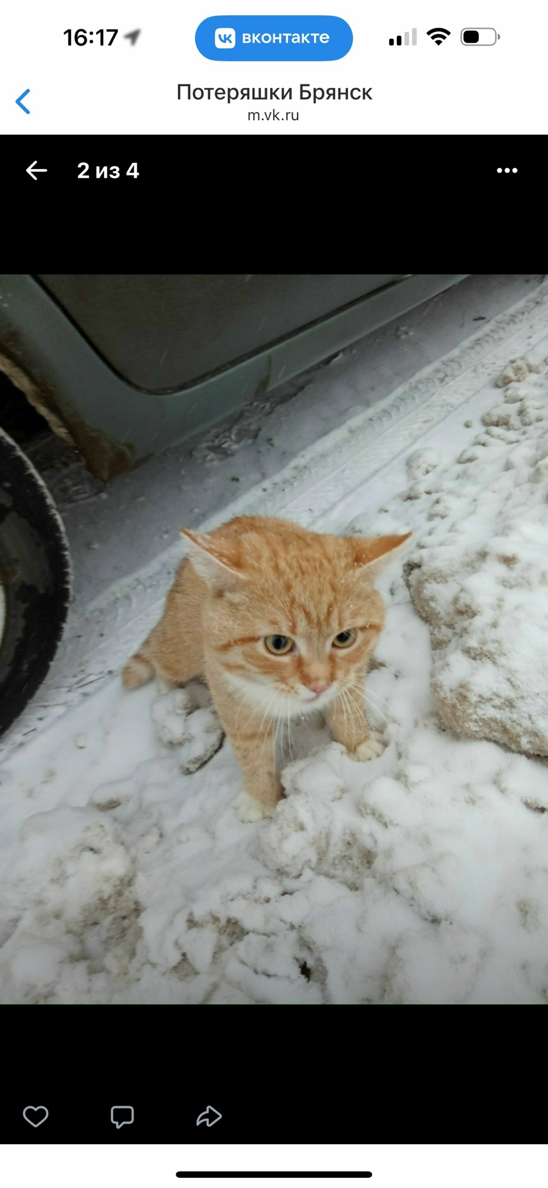 Был найден кот рыже-белого окраса в районе Ходаринки (+- в 15:00 02.01). Сидел на дороге, мёрз. Чистый, очень похож на домашнего, но сидел на месте и никуда не уходил. P.S. Кота забрали на передержку, но очень хочется, чтобы нашёлся хозяин.