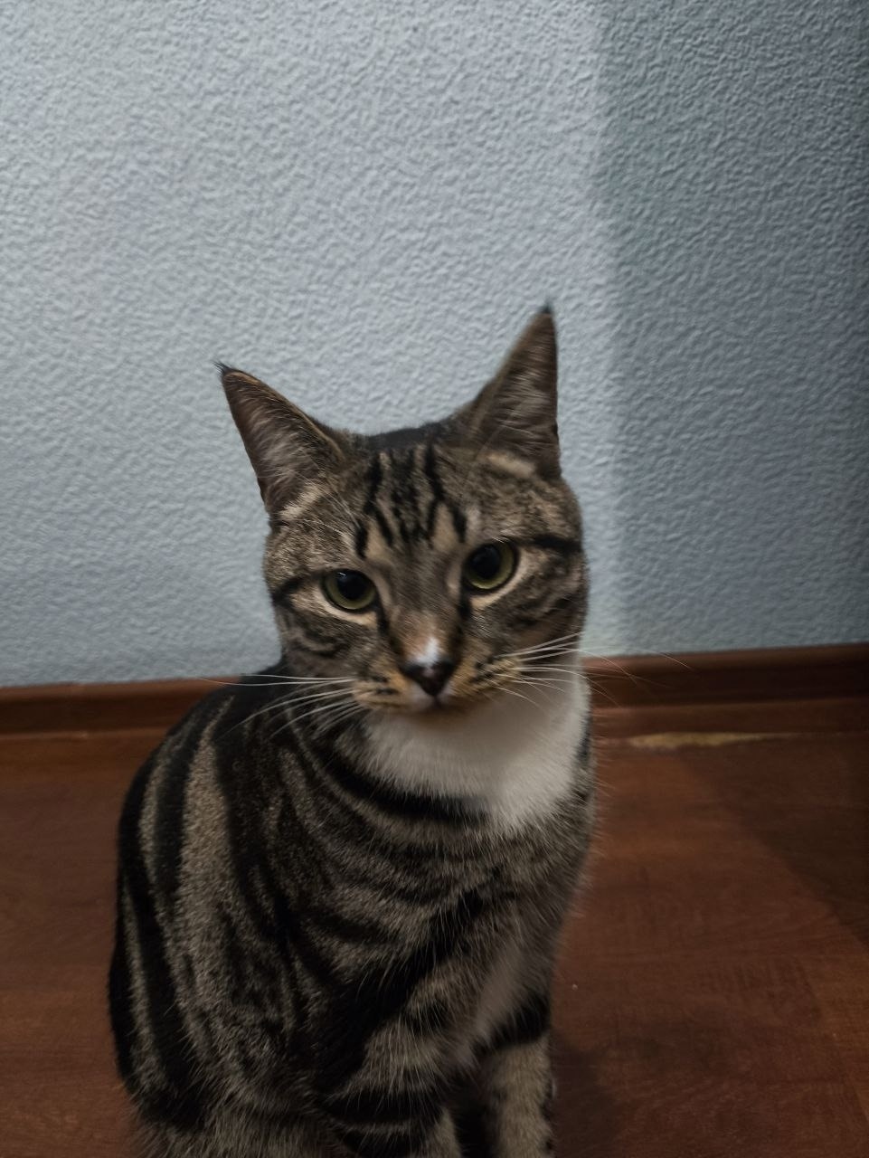 Возраст 2 года. Окрас серо-коричневый полосатый, зелёные глаза, темный носик со светлой чёрточкой, пухлого (крупного) телосложения.