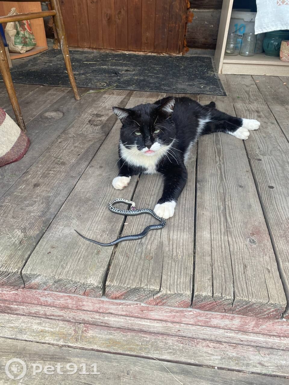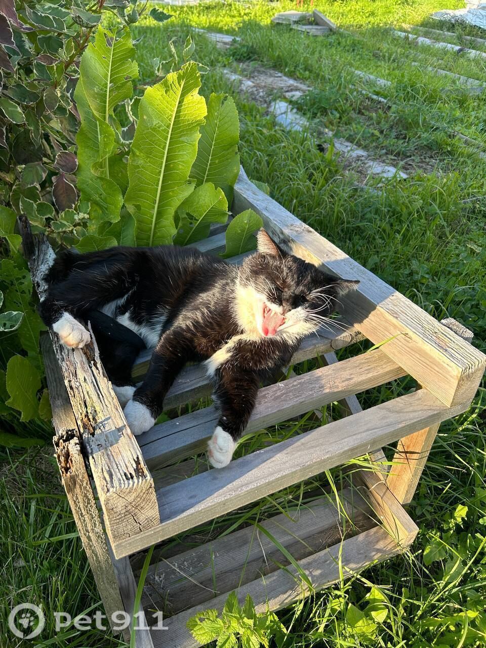Белое брюшко, все четыре лапы белые, как в носочках, длинные усы и брови, на левой части тела белое пятнышко
