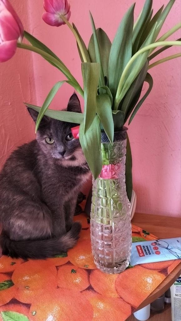 Окрас: серый с белым и рыжеватыми пятнышками. Фима ласковая и игривая кошечка, 2 года. Откликается на кличку. Скорее всего, выпрыгнула из окна первого этажа.