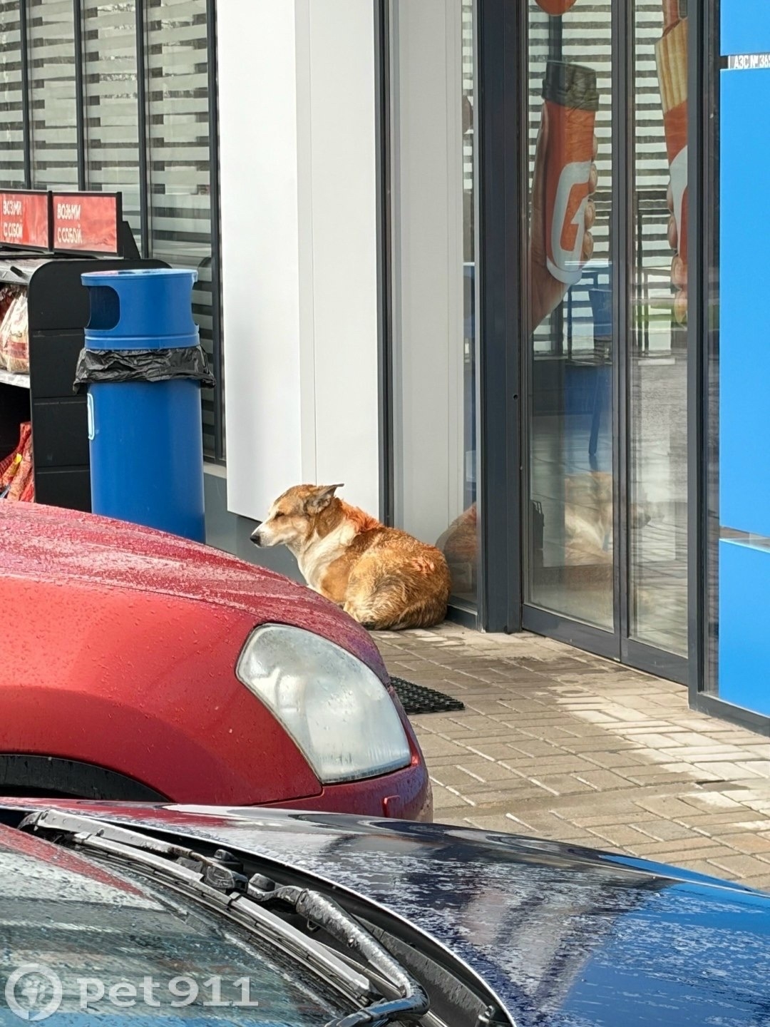 Бело-рыжий кобель. Похоже, был сбит, характерные следы крови на корпусе. Пристает к каждому прохожему. Не истощен, шерсть ухоженная, явно не бродячий пес