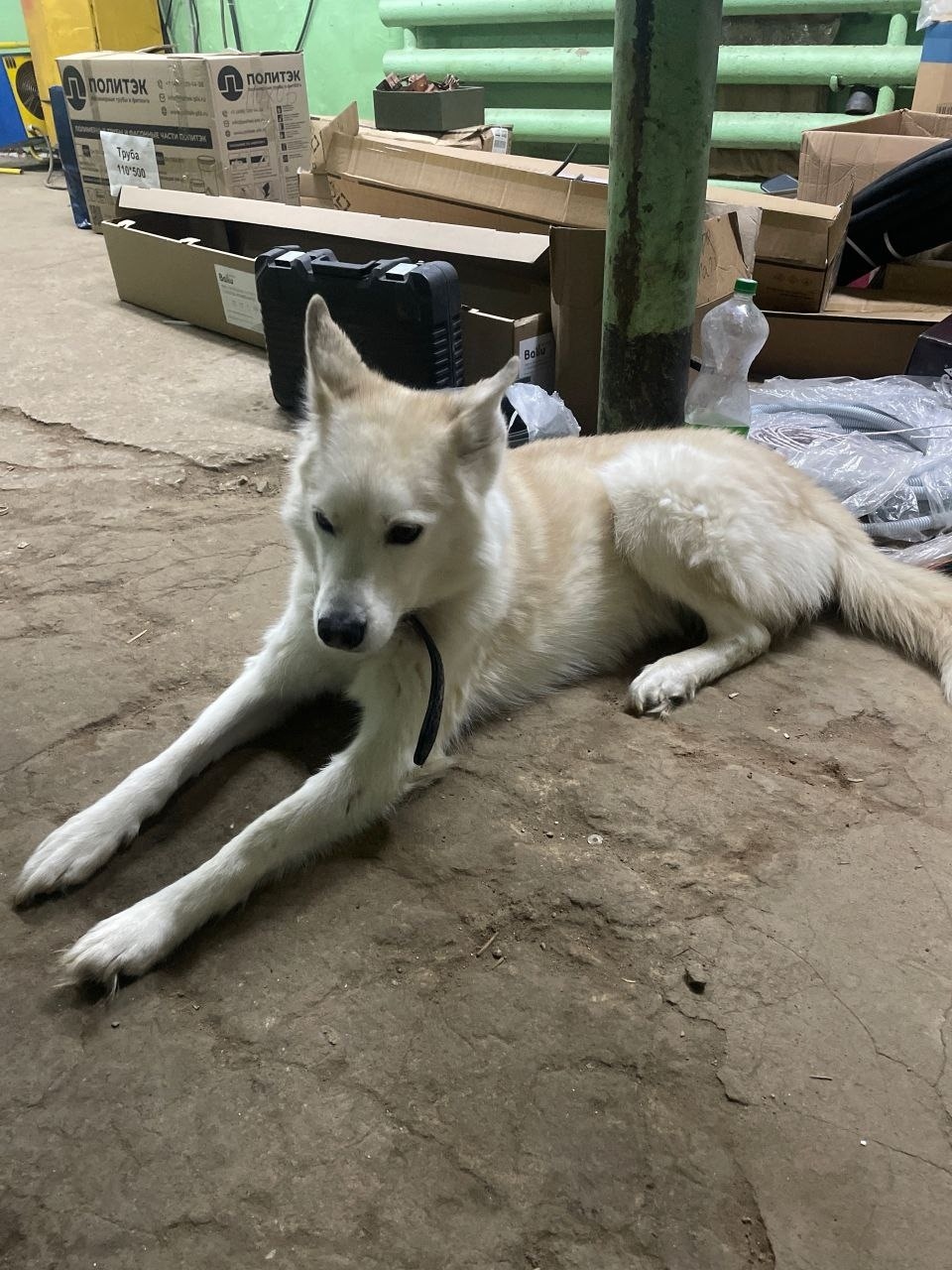 З-д ,,Точмаш", прибилась собака с ошейником, предположительно кобель, прокушена лапа, не встаёт на нее.