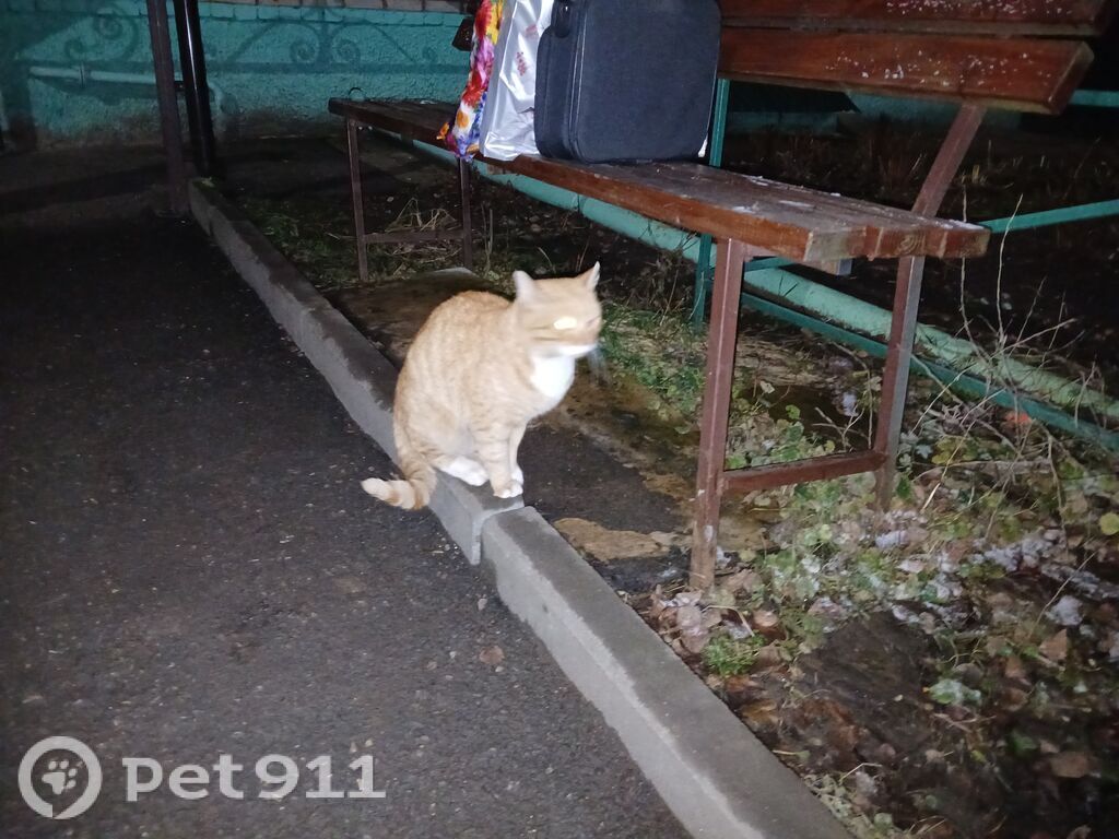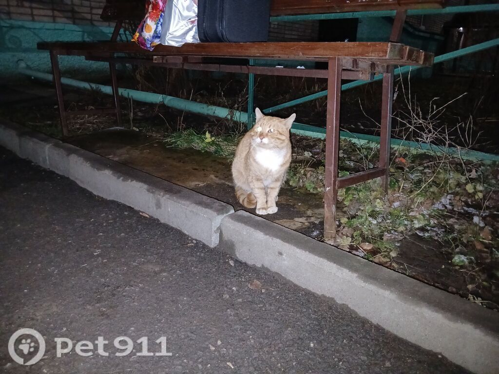Котик рыжий, упитанный. Очень ластится к людям. Просит у них помощи. Видно, что бывшедомашний.