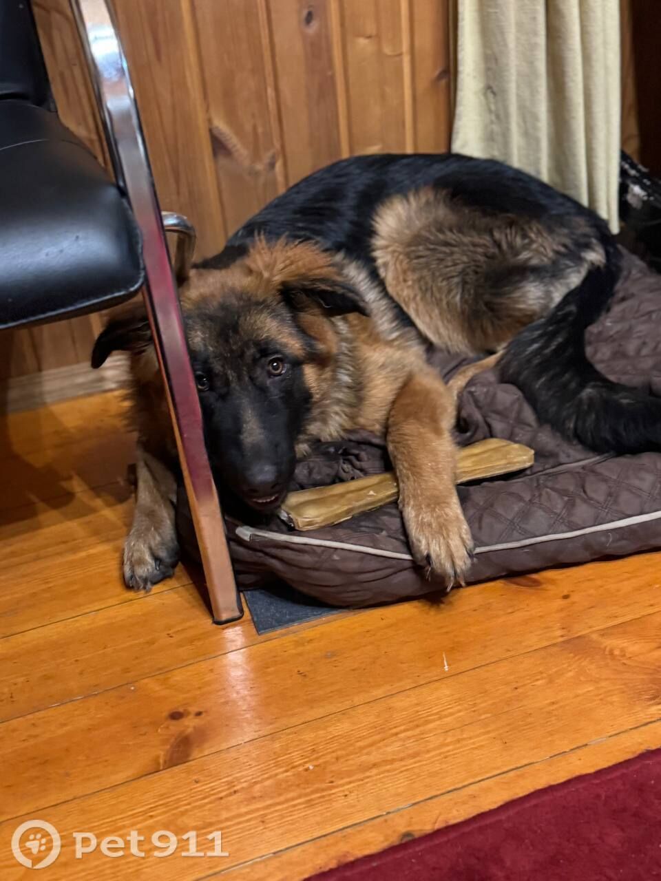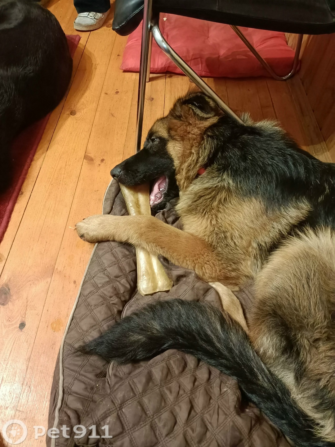 Немецкая овчарка, на ошейнике красная бирка (адресник) в виде косточки, с контактами для связи. Убежала днём во время прогулки.
