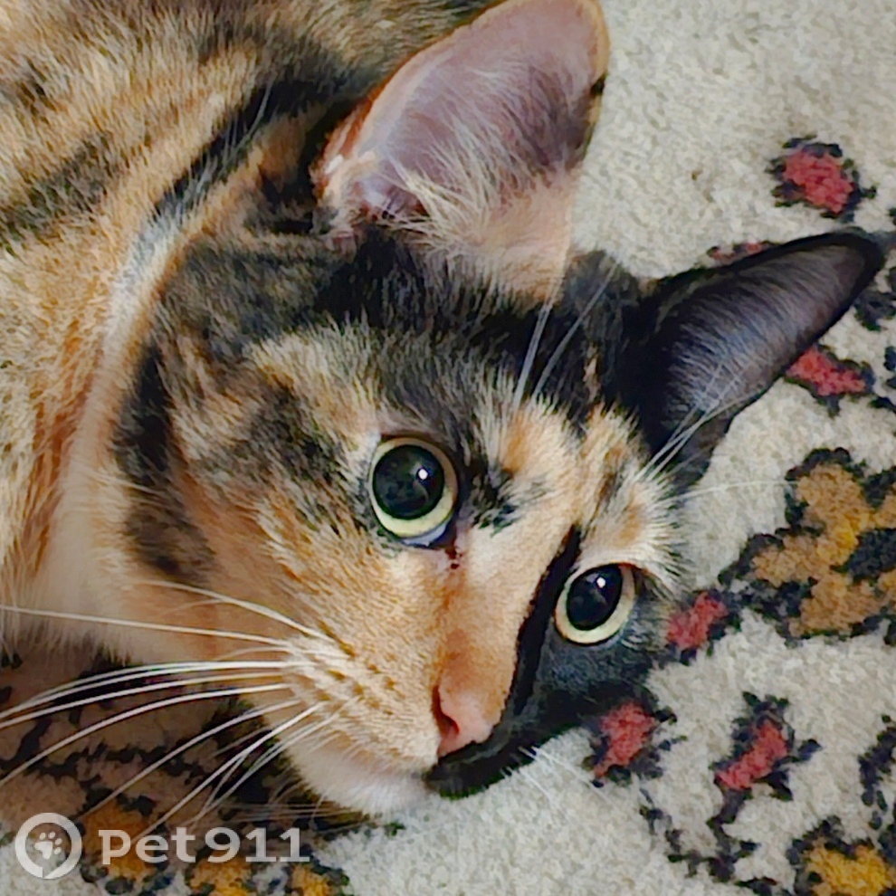Пятнистая гладкошерстная кошка, рыже-бело-чёрная. На носу чёткая линия, на одной стороне мордочка чёрная, на другой рыжая. Хвостик тёмный, на всех лапках белые «носочки». Кошечка очень пугливая. Видимо, вышла на балкон, пока мы не заметили и соскользнула со второго этажа, куда-то убежала.