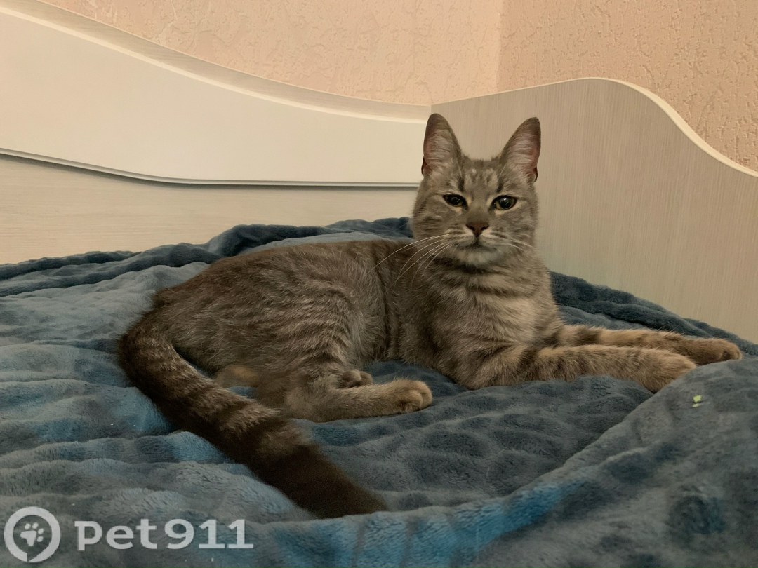 Серая, полосатая кошка. Говорливая, игривая. Очень громко мяукала на улице, бегала через дорогу за прохожими