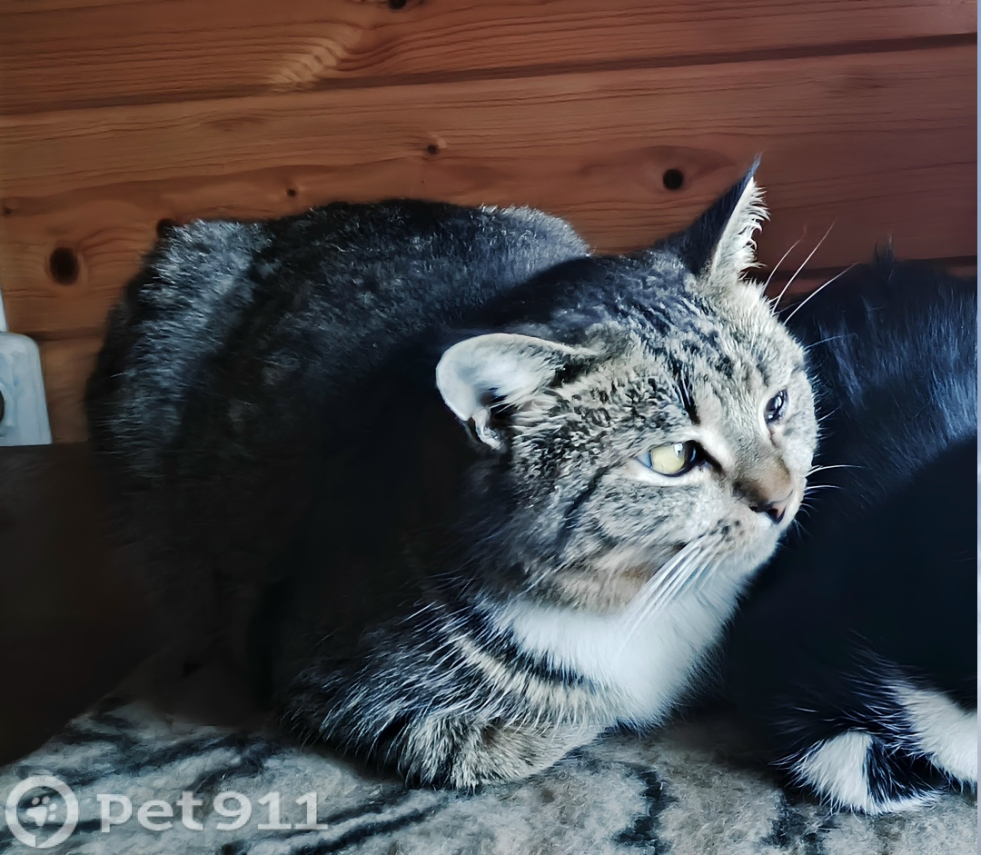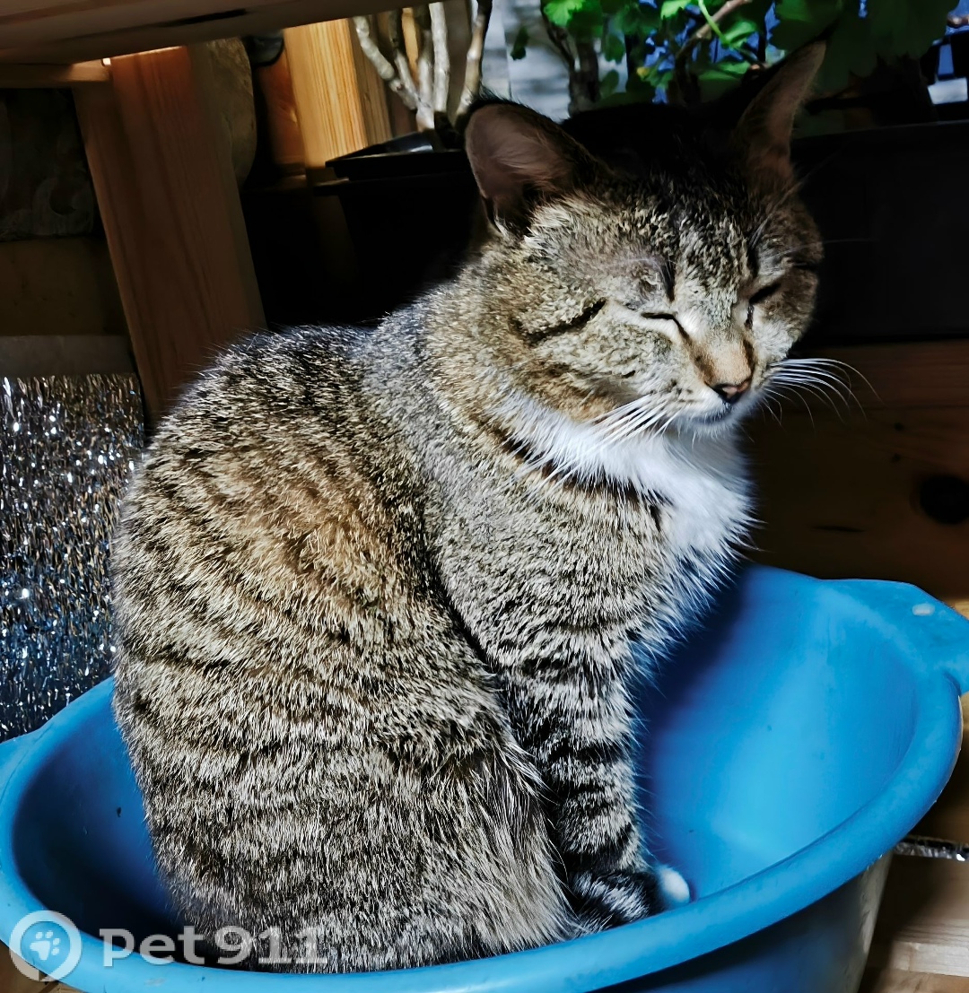 Некрупная, кошка обычного телосложения. Окрас табби: Серо-коричневый фон с тёмными, ровными полосами На лбу характерная «М»-образная отметина Белое пятно на подбородке и груди, частичные белые отметины на лапах Полосатый хвост с тёмными кольцами Ключевой признак: симметричный табби-рисунок и белая «манишка». Кошка очень пугливая.