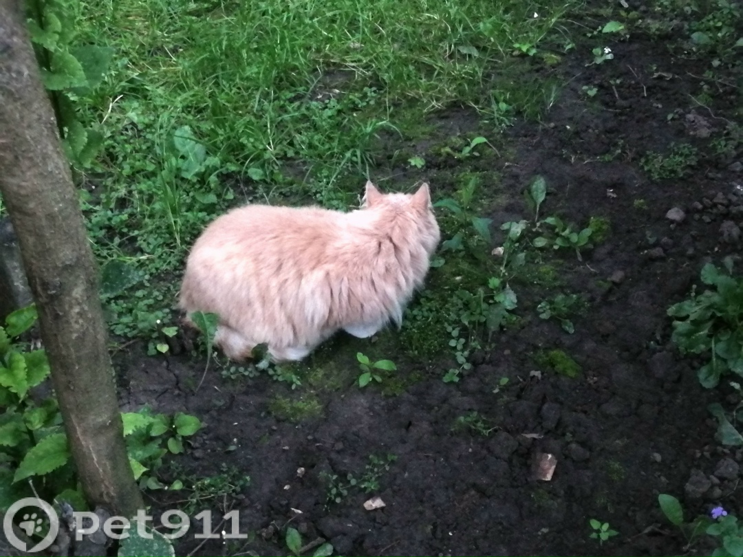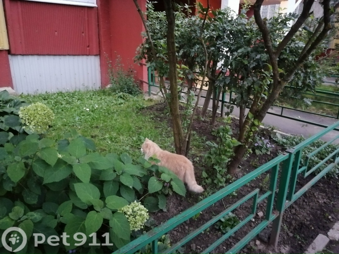 Во двое дома 3А на улице Комиссарова, в 4:40 обнаружен кот. Кот, судя по всему домашний. Ласковый, спокойный. Всё время сидит в клумбе.