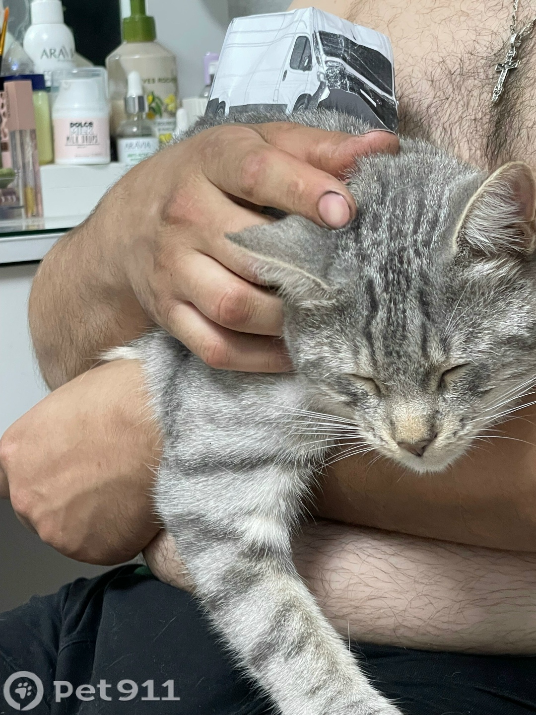 Бело серый. На пузе пятношки, полосатый Хвост как у лимура колечками. Одет черный ошейник. Кастрирован.