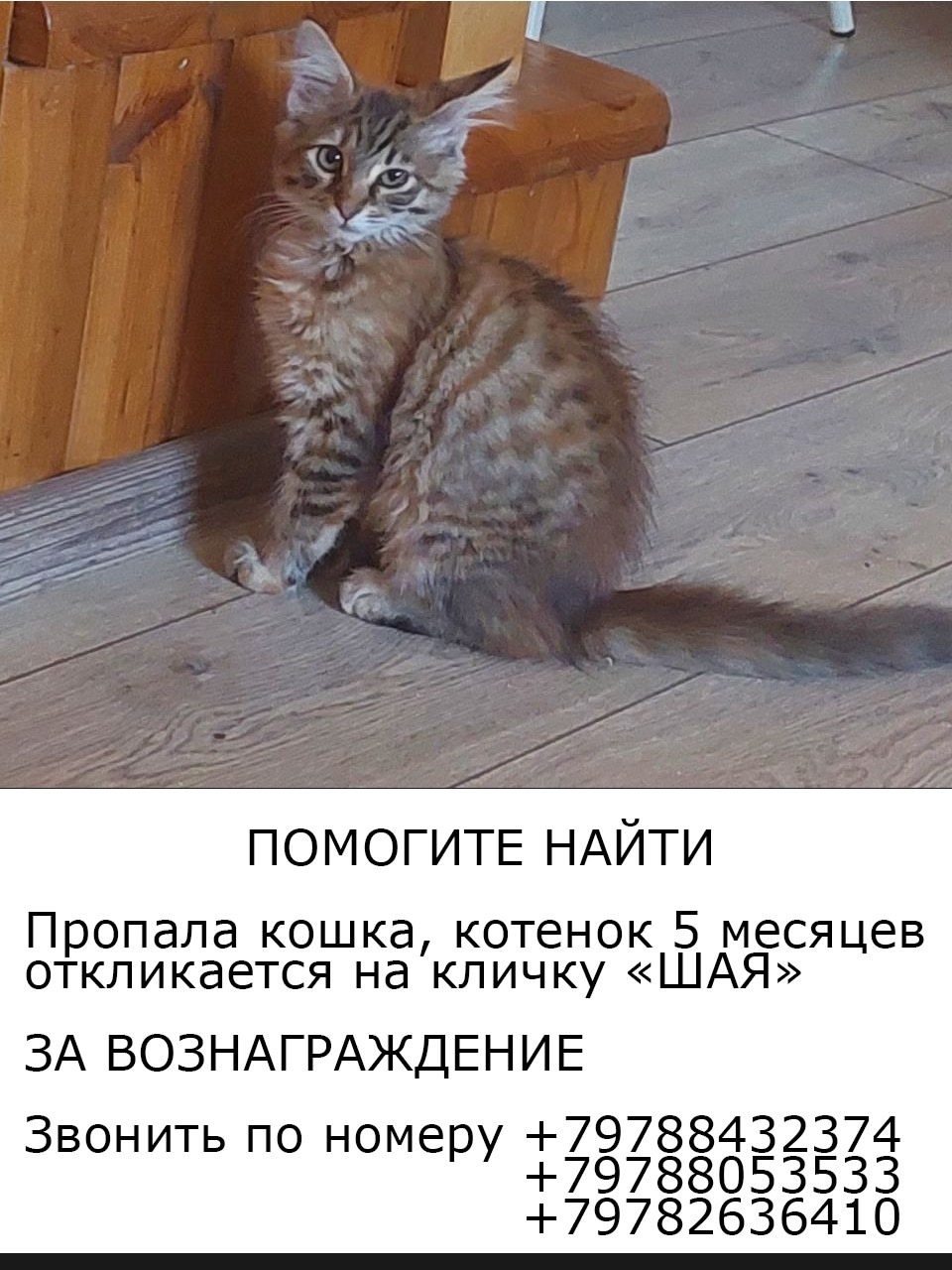 г. Симферополь . Добрый день! Помогите найти! Пропала кошка, котенок 5 месяцев.Кличка Шая. 14.09. По ул Красноармейской. Может находиться в районе ул. Ефремова, Ленина.Может кто-то видел. Кошка испуганная. Тяжело идет к чужим людям. Могла чего-то или кого-то испугаться и убежать дальше. Важна любая информация. контакты.