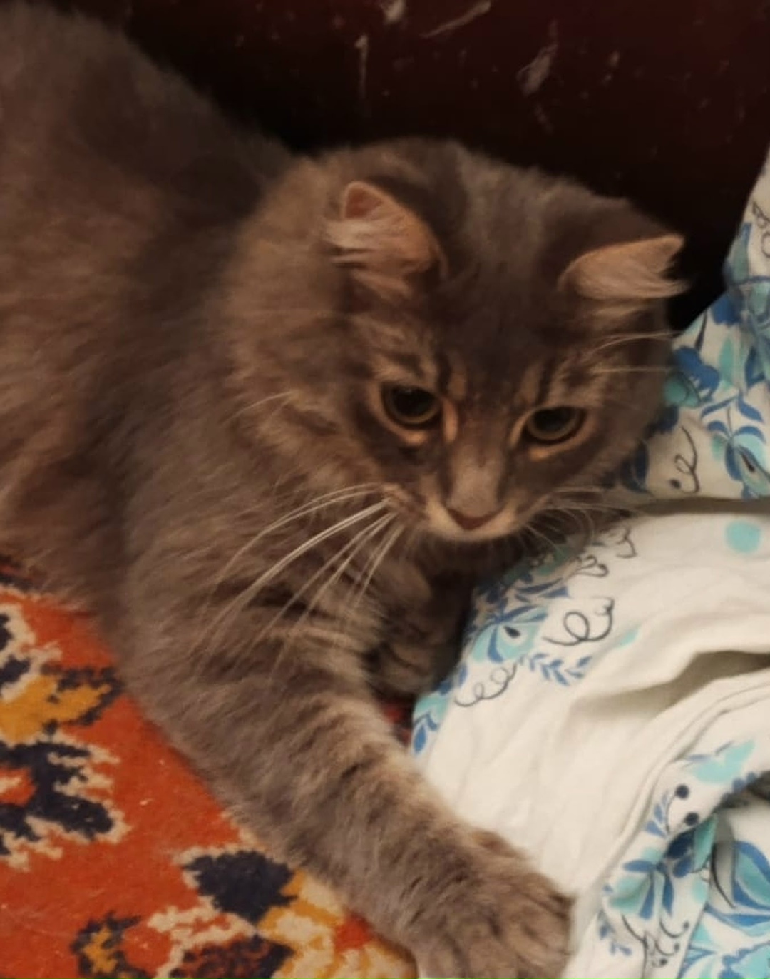 Приметы: возраст 2года, серый окрас, длинная шерсть, глаза зеленые, кот осторожный пугается посторонних людей