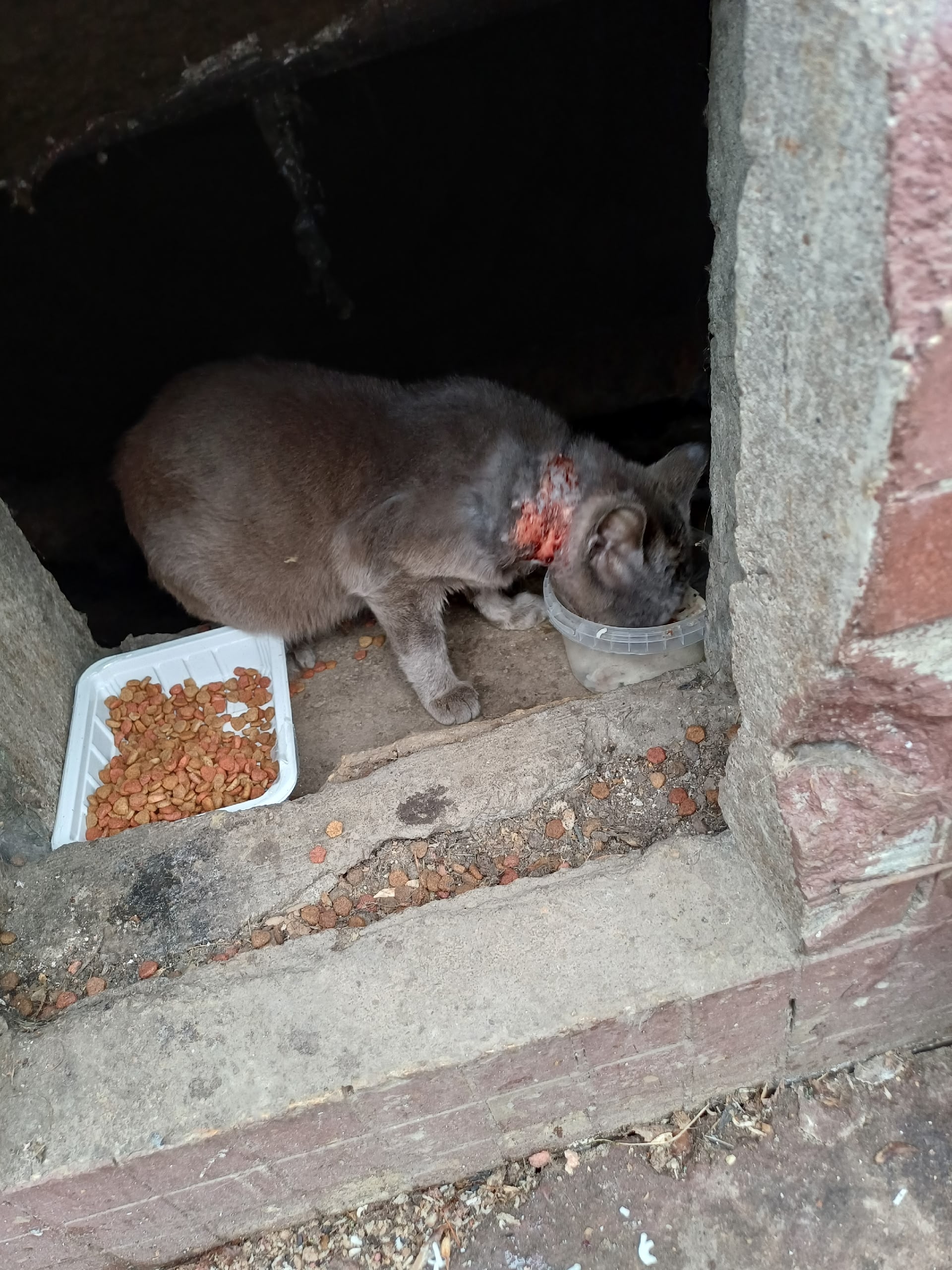 Невский район, 3-й Рабфаковский!!! Чей кот???? Ранен. В руки не даётся. Себе взять не могу( можете закидать меня тапками), у самой шестеро животных и все больны, начиная от МКБ, кончая онкологией. В клинике большой долг. Я не возьмусь за него. Покормила. Это всё, что я могу для него сделать. Если кто-то решит помочь- пишите. Звонить мне 8(921)984-71-13. Ирина.