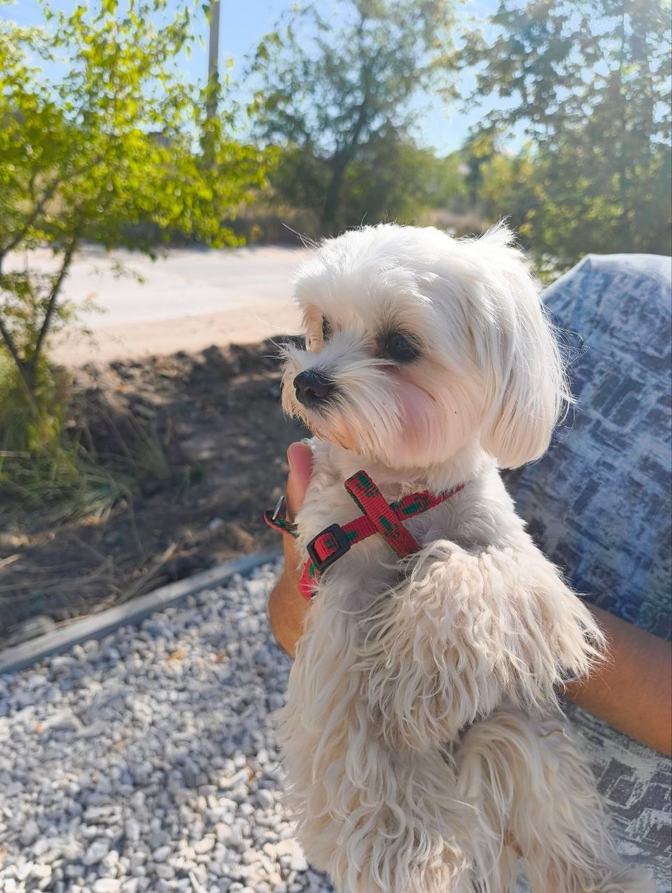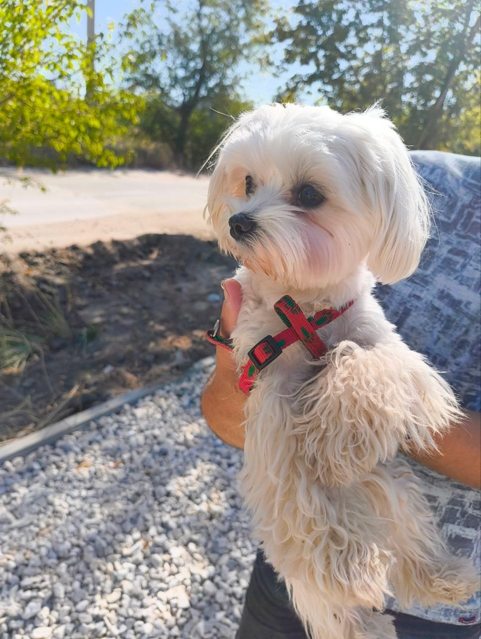 Найдена собака на Бахтурова, Красноармейский район. Похожа на болонку, девочка, ухоженная, красная шлейка. Чуть не попала под машину.