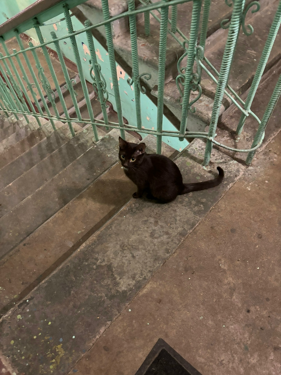 В подъезде нашли кошку шоколадного цвета с белым пятнышком на груди. Достаточно ручная. Видно, что к людям приучена. Как будто от кого-то сбежала.
