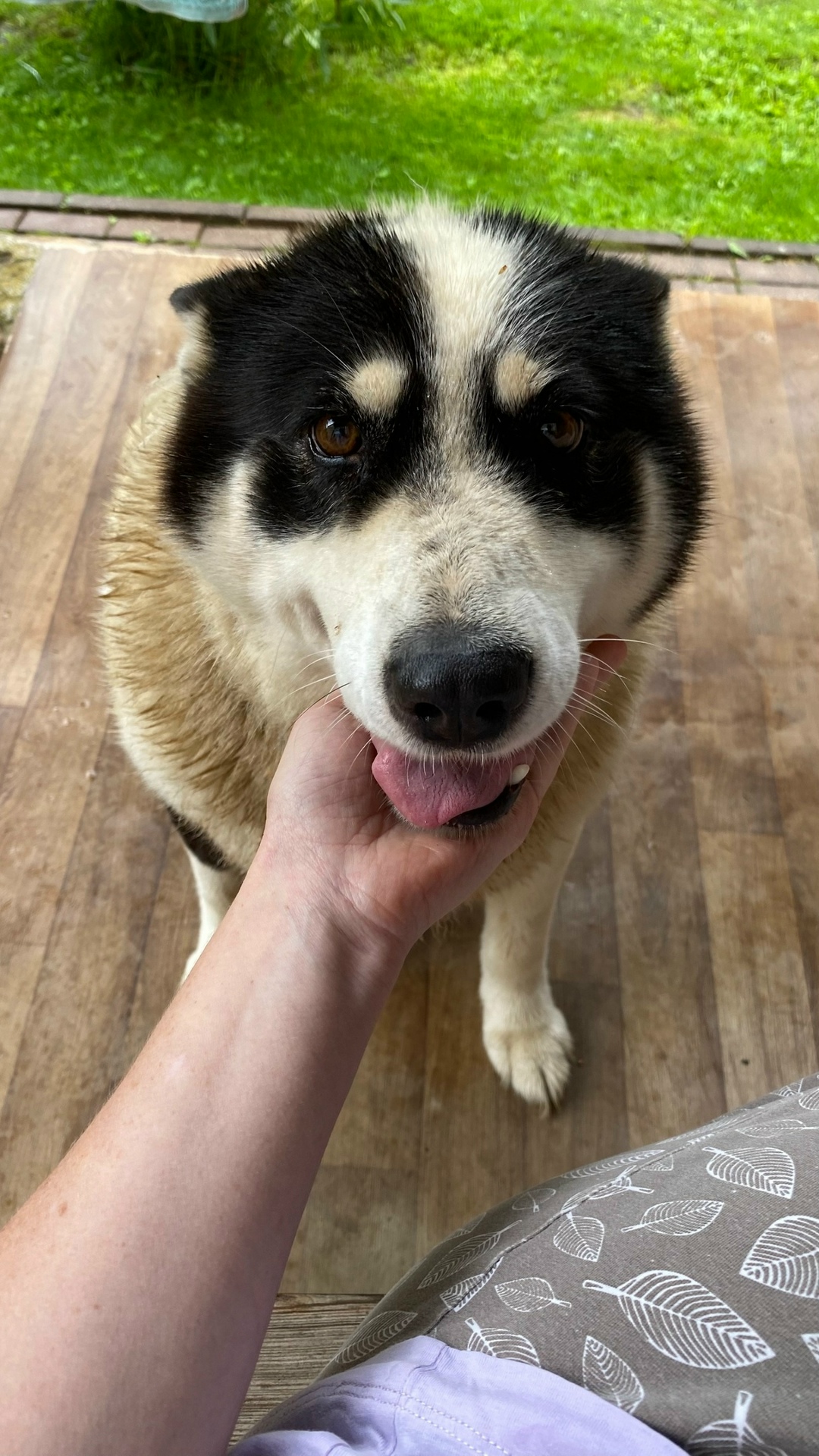 Вроде девочка. Большая, добрая, прихрамывает на задние лапы.