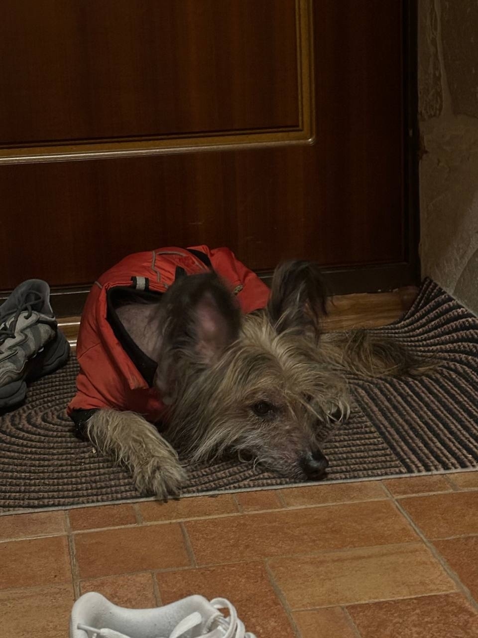 Найденный 7 декабря 2025 года в посёлке Дубровицы серо-бежевый кобель китайской хохлатой (?), одетый в красный комбинезон, срочно нуждается в передержке! Придержавшие больше не могут оставлять у себя!