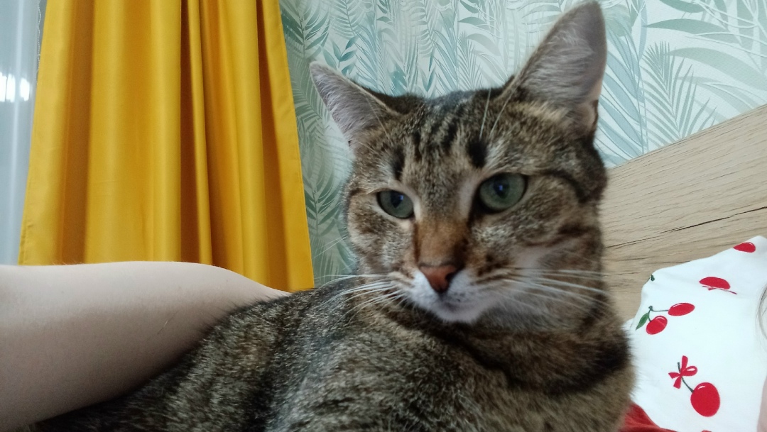 Тёмно-серая в чёрную полоску, глаза зелёные.