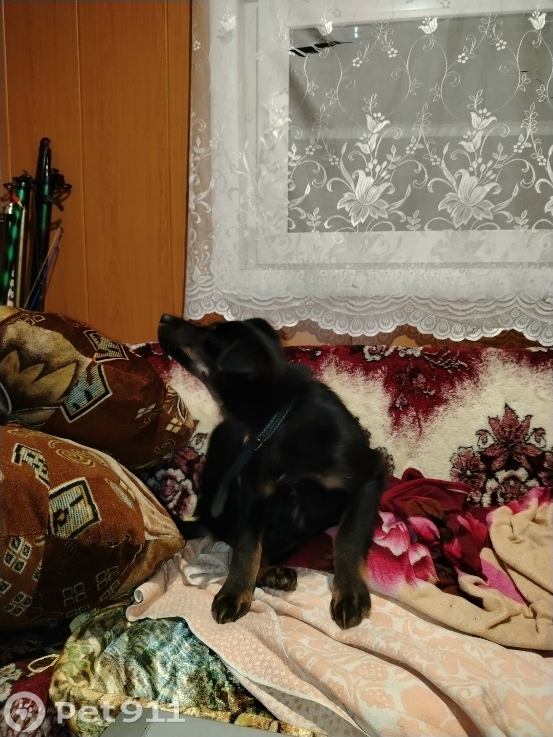черный с подпаленами темно-коричневыми Веселый игрывый, на кличку не подбегает, еще не совсем приученый. Оставили его в дровенике, пришли а его нету нигде там, видимо через щели и выбежал, хотя думал что не пролезит.