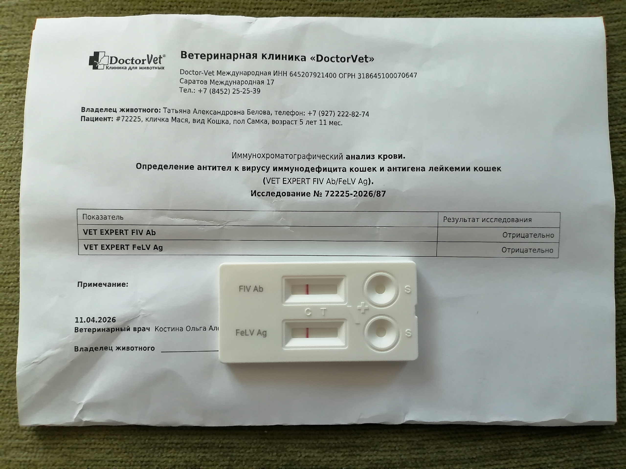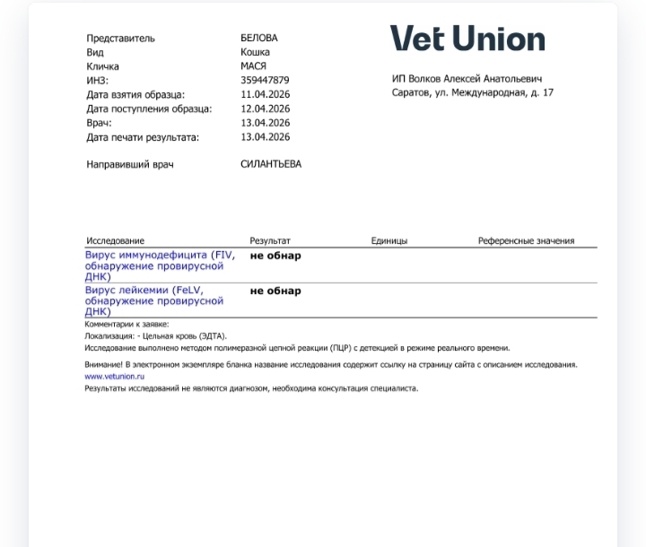 Нашли документы от 2021 г и два теста на ВИК/ВЛК. В тот день проверяли двух кошек и врач пронумеровал их как кошка 1 и кошка 2. Решили перепроверить Масю и результаты отрицательные.