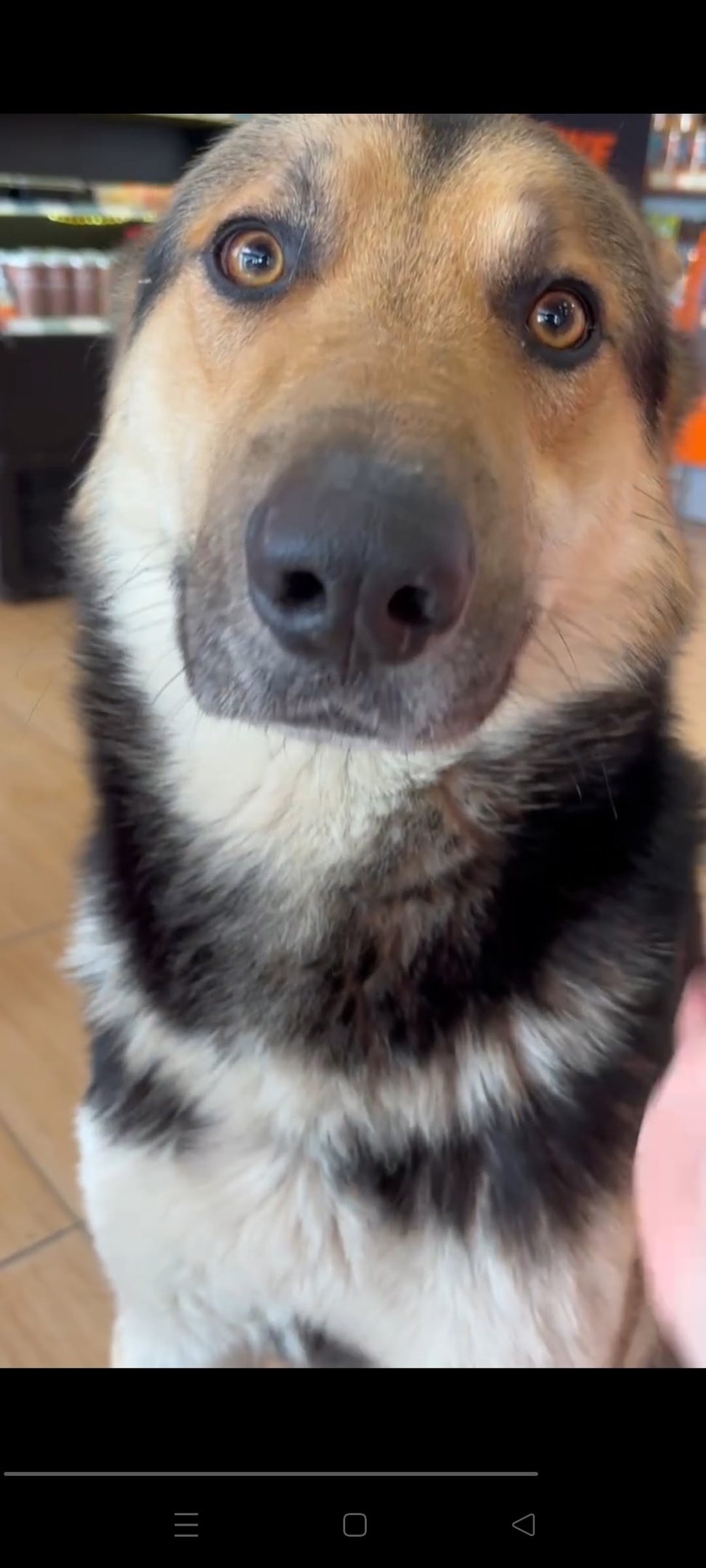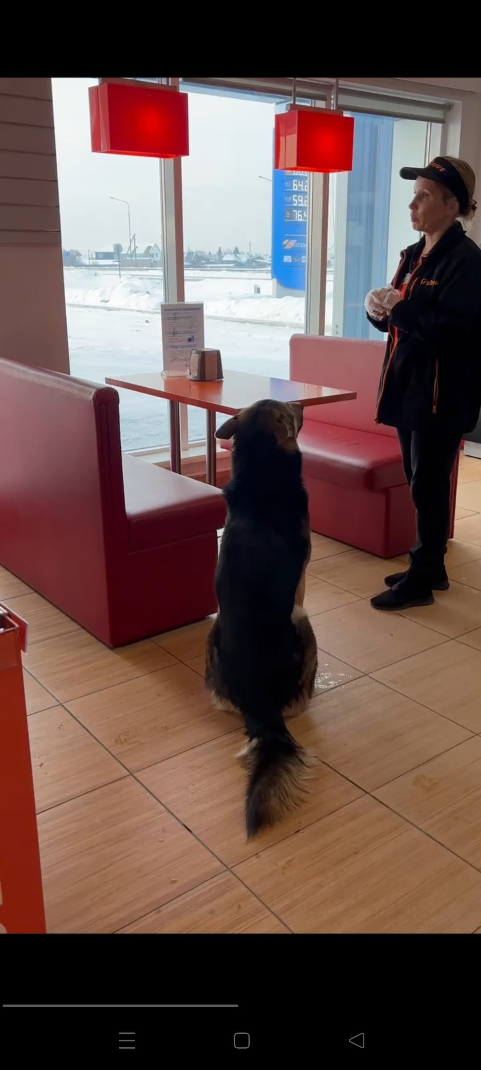 Собака очень ждет и заглядывает в глаза каждому. Мы не смогли пройти мимо: девочки на смене сейчас придерживают его, но долго оставаться на заправке он не может.