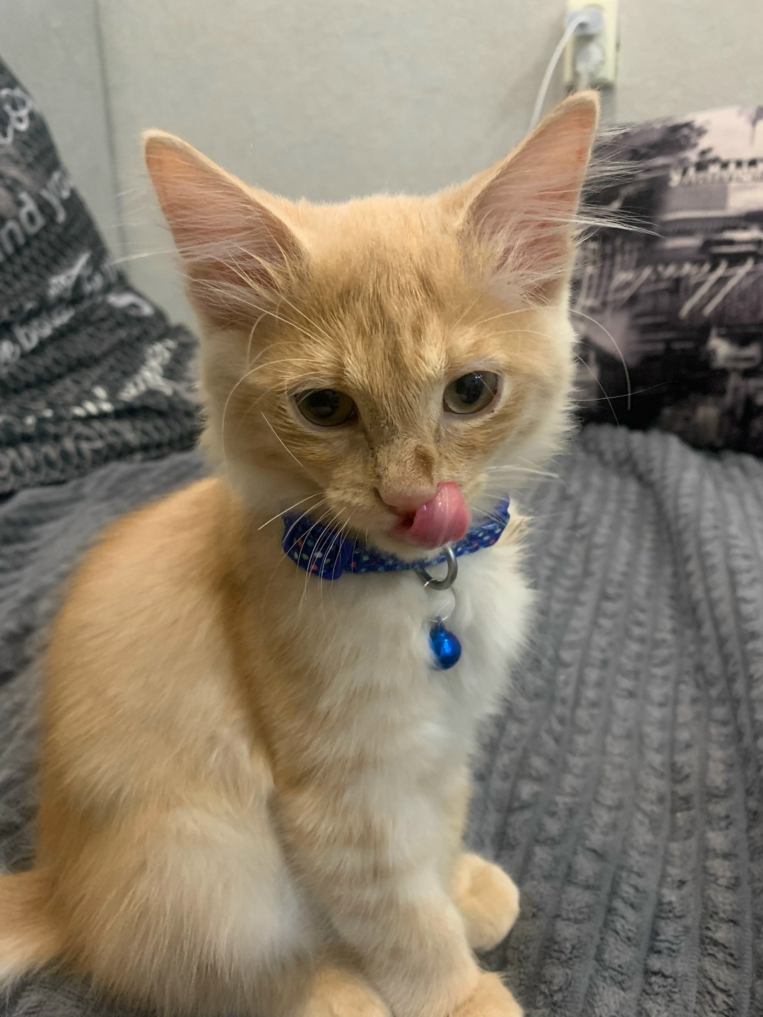Найден котенок, мальчик рыженький с ошейником! Бегал возле подъезда и забежал вместе со мной, потом сидел возле двери долго. Пустила, помыла и покормила. Чья потеряшка? Район северный