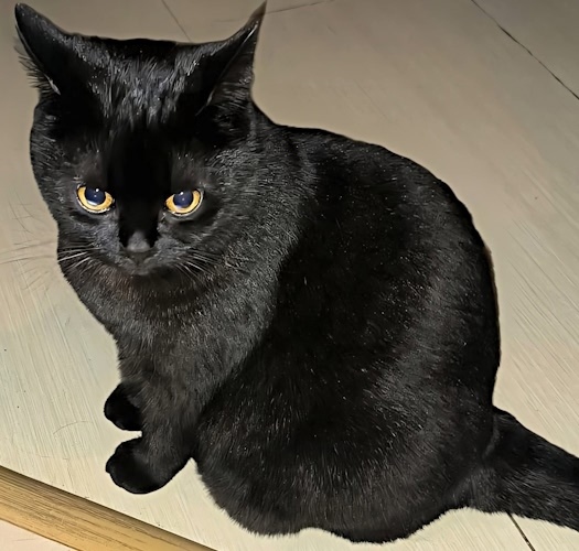 Описание кошки: полностью чёрная без пятен , гладкошёрстная, глаза цвета солнца. На сгибе задних лап с внешней стороны есть залысины, как будто выбриты кружочки (были обморожены), обвисший животик. Возраст примерно около 5 лет.