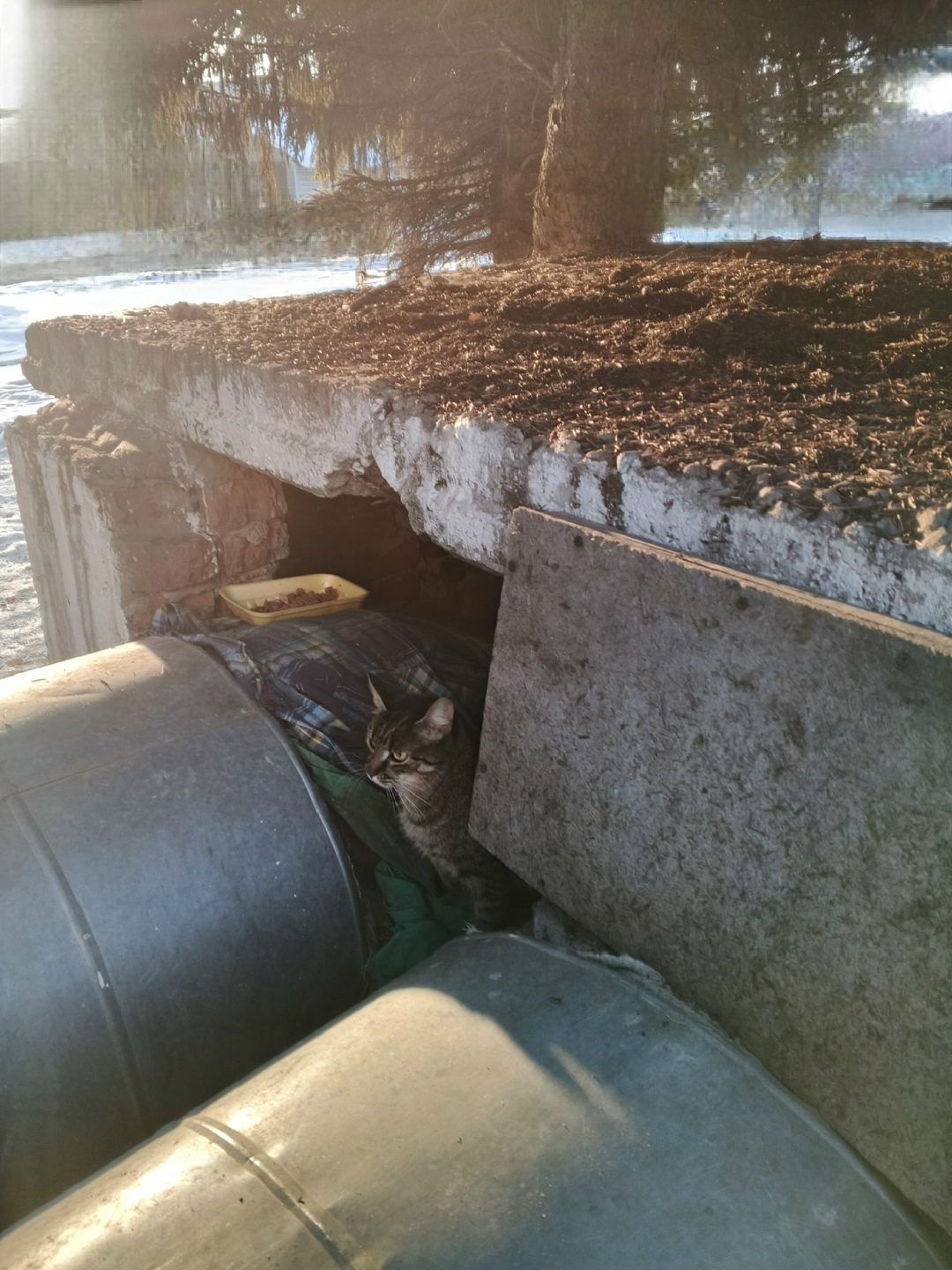 Чёрненький, милый игривый и озорной малыш выживает с мамой шпротинкой на теплотрассе в опасном месте. Чужих опасается, но заигрывает с человеком, по размеру совсем маленький,на фото намного больше месяца два наверное. Что его там ждет?