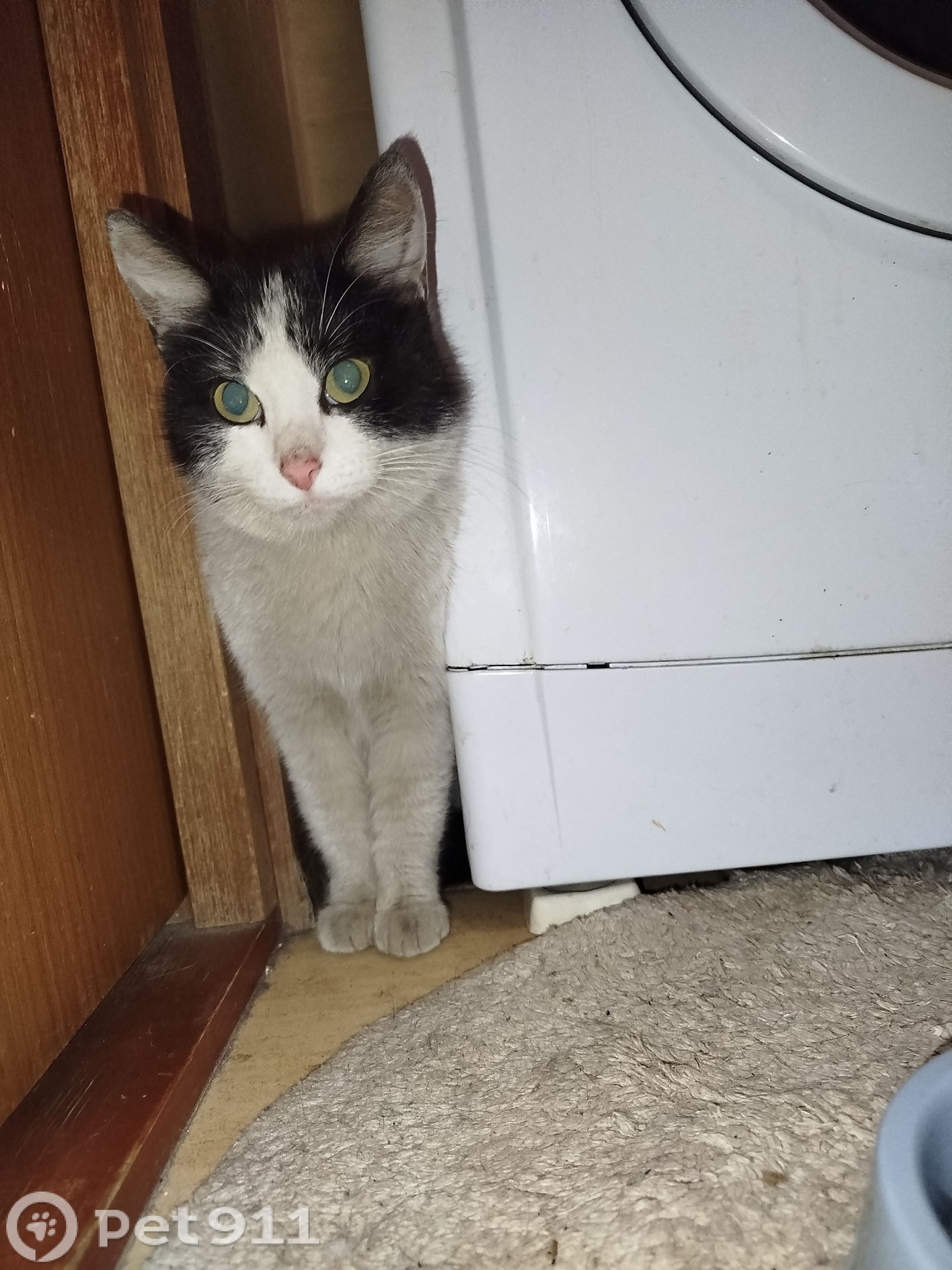 Черно белая, довольно пушистая. Стрелка на лбу, пушистый хвост, светло жёлтые глаза. Очень ласковая, не боится человека, подставляет пузо, тонко мяукает когда одна. Мурлычет как трактор. Но боевая - на собаку рычит будь здоров. Хотя на руках вела себя спокойно. Не отощавшая, но не толстая. Миниатюрная. На пузе колтуны, пыльная. Явно уже пару недель так.