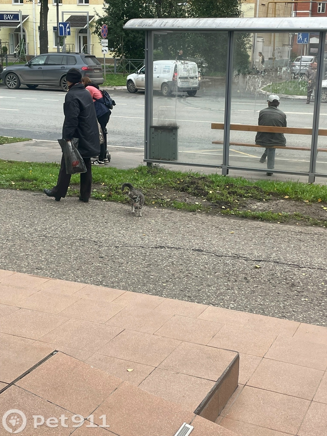 Голубой ошейник с розовой подвеской. Окрас серый, пятнистая. Играет с прохожими. Рядом с кафе Светлица.