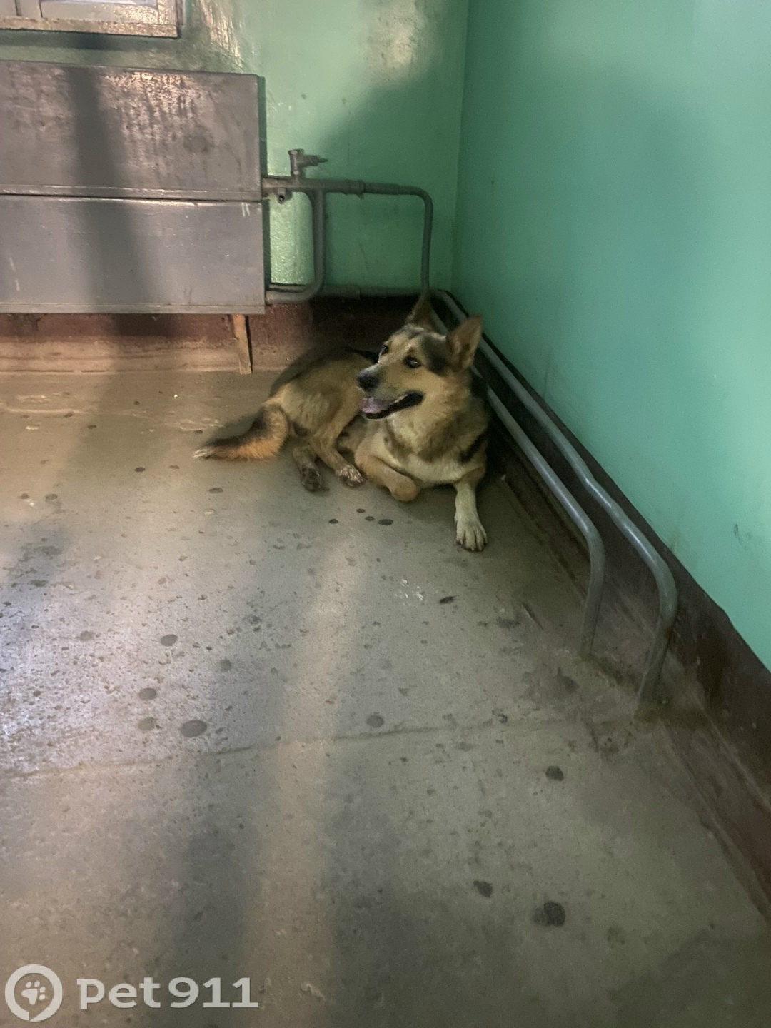 В подъезде между первым и вторым этажом лежит пес, испуганный и уставший, задняя правая нога травмирована. Без ошейника.