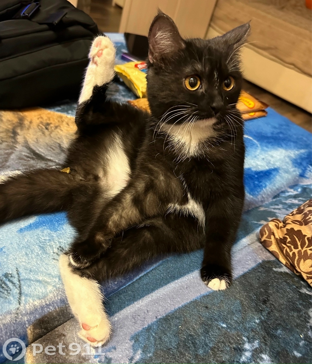 Черно-белая; лапки задние белые, передние на когтях белый окрас, шея и живот белые. Пропала утром, балкон был открыт. Раньше на улице не была