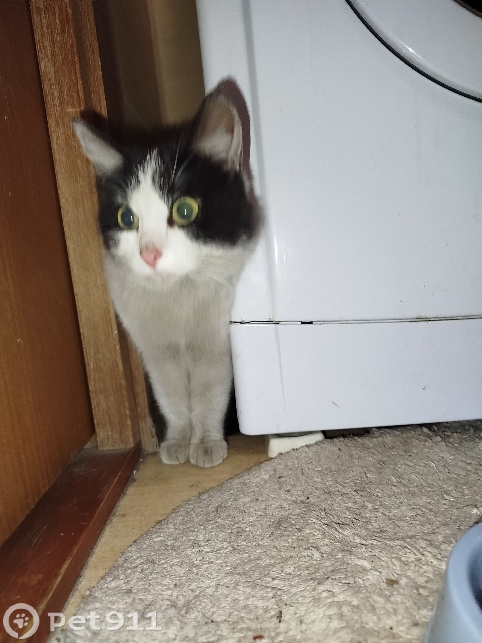 Черно белая, довольно пушистая. Стрелка на лбу, пушистый хвост, светло жёлтые глаза. Очень ласковая, не боится человека, подставляет пузо, тонко мяукает когда одна. Мурлычет как трактор. Но боевая - на собаку рычит будь здоров. Хотя на руках вела себя спокойно. Не отощавшая, но не толстая. Миниатюрная. На пузе колтуны, пыльная. Явно уже пару недель так.