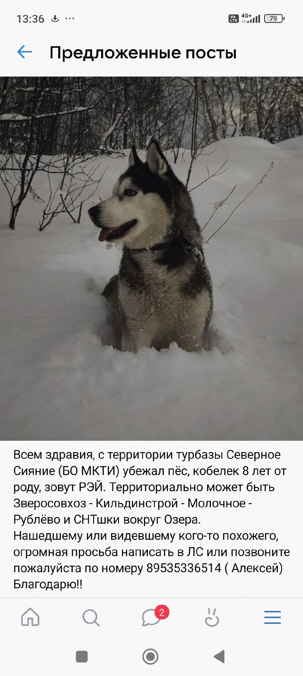 Всем здравия, с территории турбазы Северное Сияние (БО МКТИ) убежал пёс, кобелек 8 лет от роду, зовут РЭЙ. Территориально может быть Зверосовхоз - Кильдинстрой - Молочное - Рублёво и СНТшки вокруг Озера.