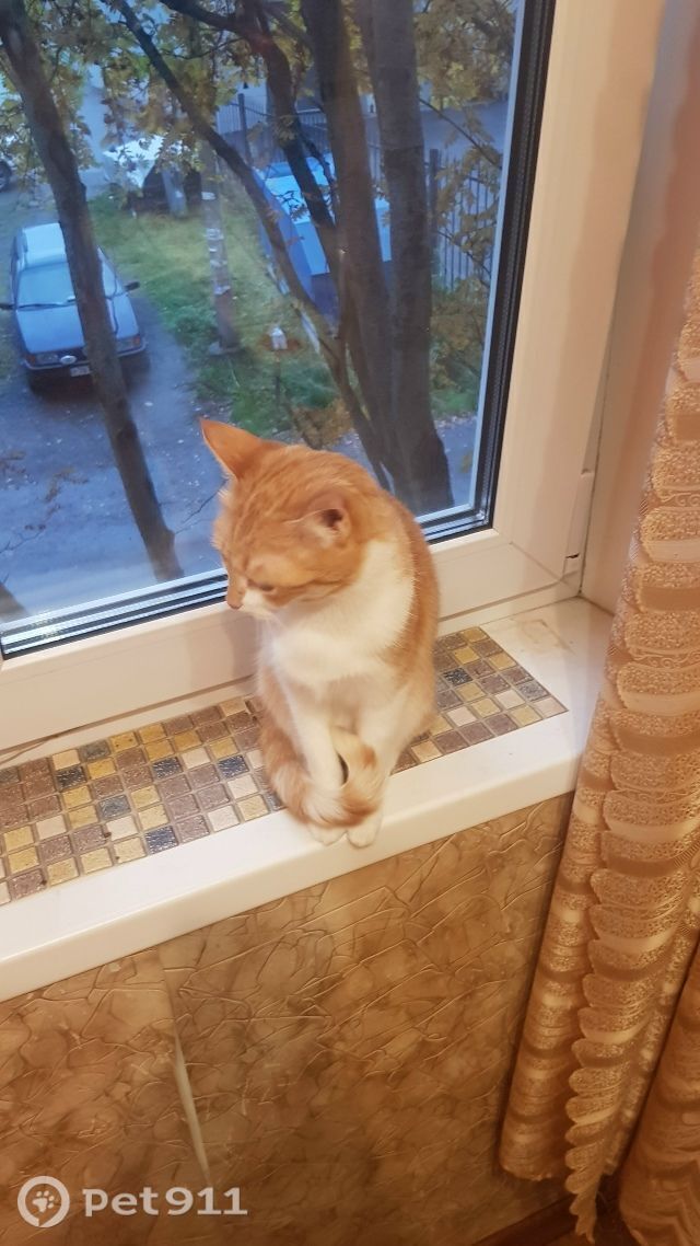 Худощавого телосложения.Окрас рыже-белый. Лапки передние и грудь белые.Выпрыгнула из окна.