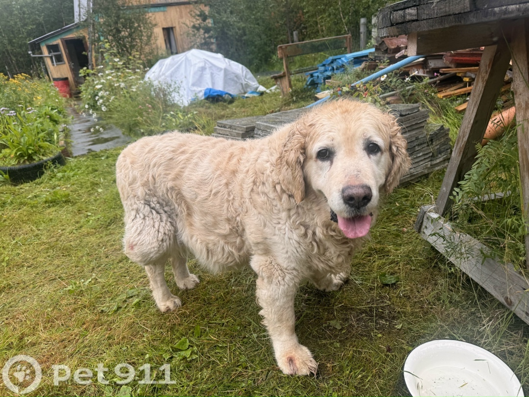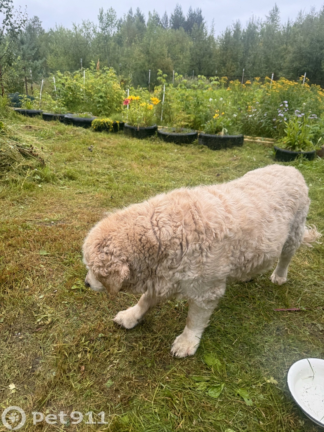 Собака в возрасте, без ошейника, с огромной опухолью на задней правой лапе. Контактная, послушная. На вид не бродяга, либо потеряшка, либо брошенка, либо живет на дачах и просто пришла в гости на ужин.