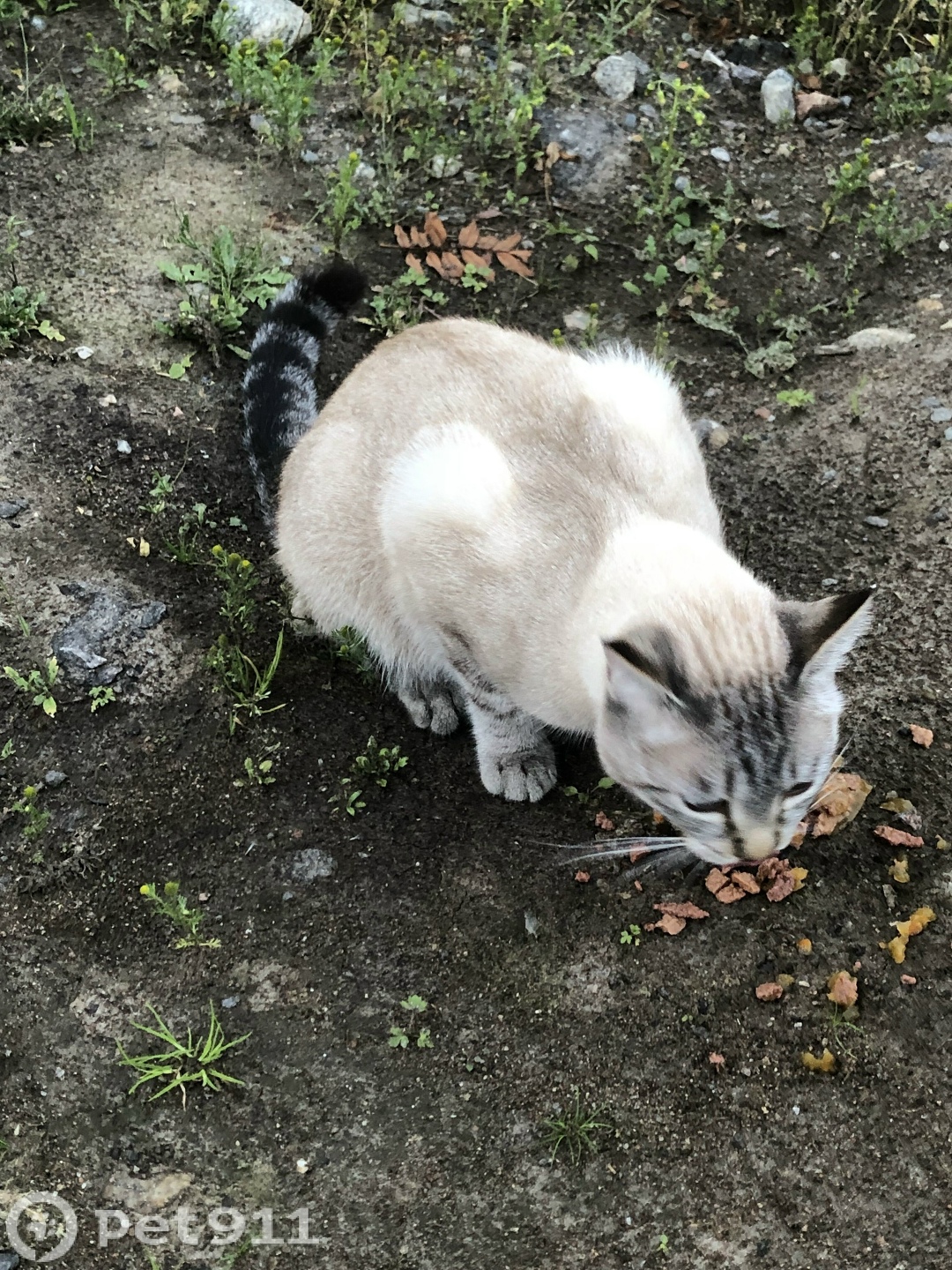 Найдена кошечка/котик, очень ласковый, слишком чистенький для уличного. Когда я подошла покормить сразу замяукал и подошёл. Не смогла разглядеть котик это или кошка. На улице Старостина.