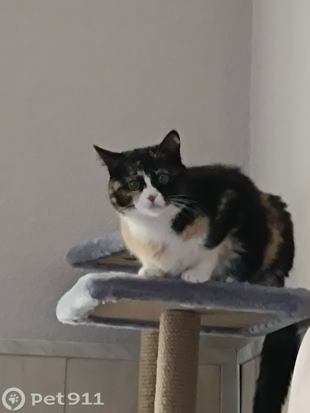 Трехшерстная, спинка поделена ровно на рыжий и на черный, на передних рыжих лапах полоски, грудь белая хвост черный без пятен