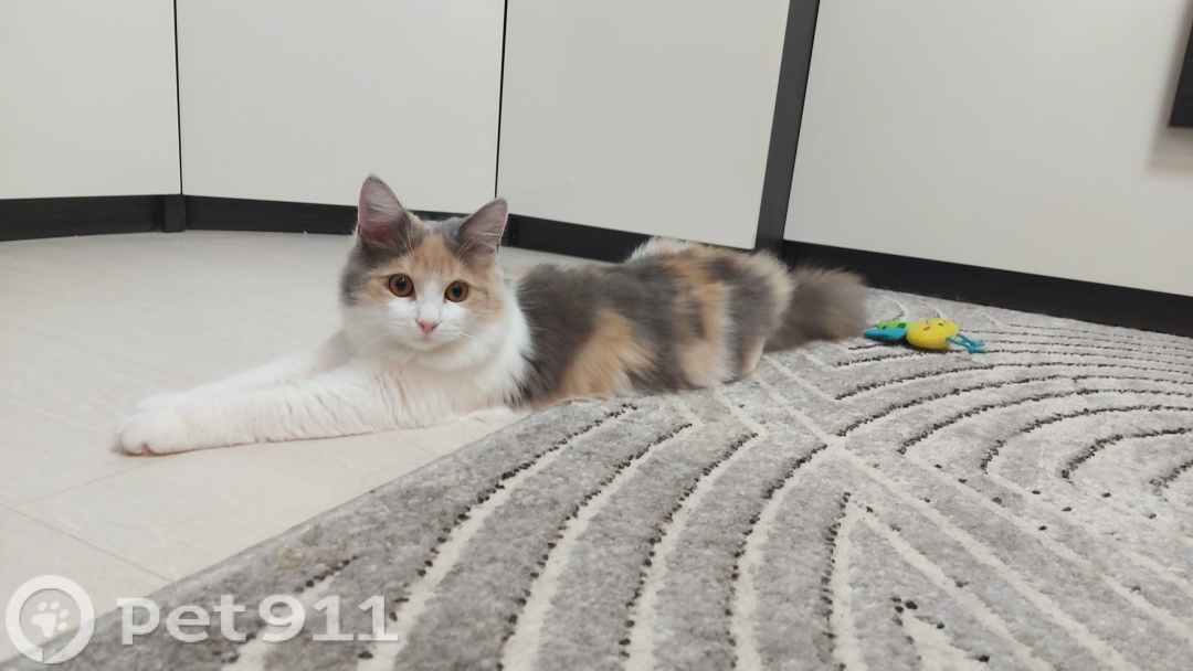 Пушистая,бело- серо-рыжий окрас, миниатюрная, 2 кг вес. Скорее всего выскочила в дверь.