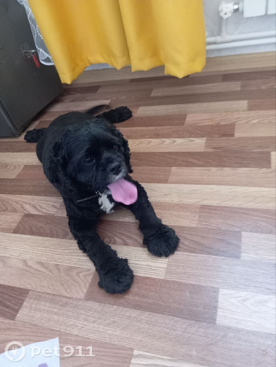 Черный американский спаниель с белым подбородком и «галстуком» на грудке, стриженная шерсть. Доверчивый ласковый пес